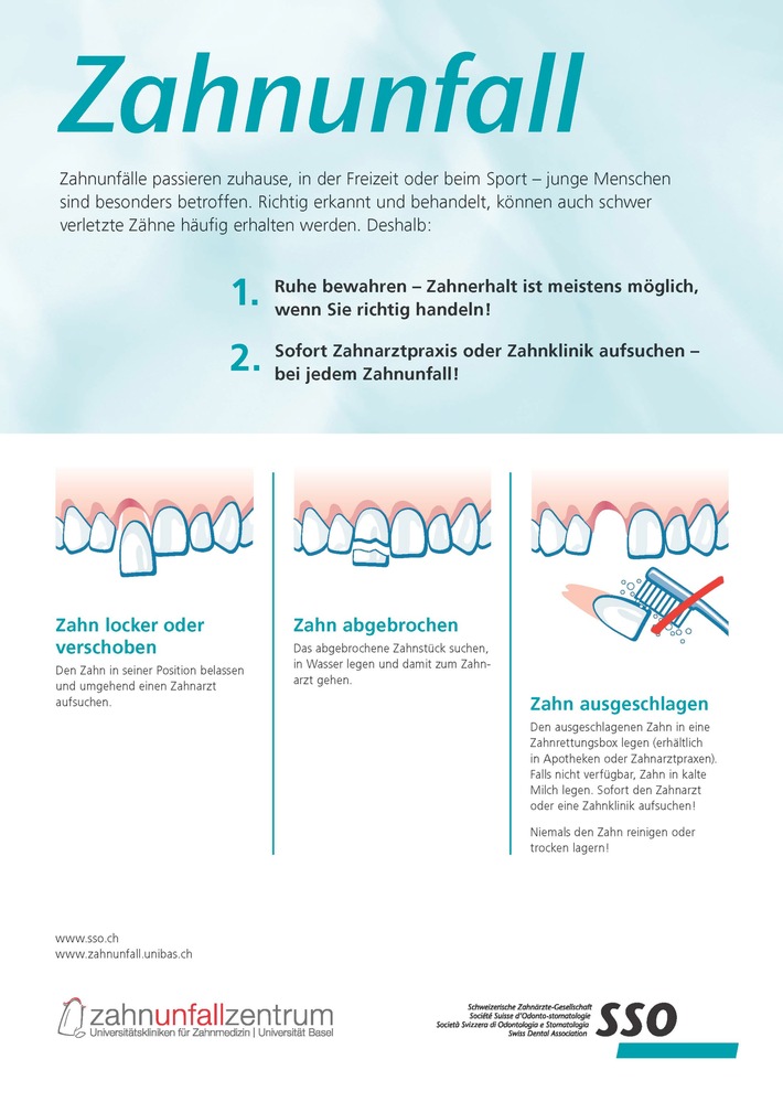 MedienmitteilungZahnunfall in der Badi - was tun? (BILD)2013-05-03T14:00:18Bern (ots) - Diesen Monat eröffnen die meisten Freibäder ihre Saison. Beim Planschen, Spielen und Ins-Wasser-Springen kann schnell ein Unfall passieren: Ein Schlag oder Sturz - und der Zahn ist gelockert, abgebrochen oder gar ausgefallen. Reagieren Personal und Betroffene richtig, können die Zähne meist gerettet werden. Rund die Hälfte aller Kinder und Jugendlichen erleidet irgendwann einen Zahnunfall. Rasches Handeln ist wichtig, denn die Folgen eines Zahnunfalls können bis ins Erwachsenenalter reichen. Wer richtig reagiert, kann die Zähne meist retten. Bei einem Zahnunfall kann sich der Zahn lockern oder verschieben, er kann abbrechen oder ganz herausgeschlagen werden. Gelockerte oder verschobene Zähne sollten nicht bewegt werden. Abgebrochene oder ausgeschlagene Zähne müssen unbedingt zum Zahnarzt mitgenommen werden. Oft kann dieser den Zahn retten und in den Kiefer zurückverpflanzen. Die gefundenen Zähne dürfen nur an der Zahnkrone und nie an der Wurzel angefasst werden. Auch wenn sie schmutzig sind, dürfen sie auf keinen Fall gereinigt werden. Zahnarzt kontaktieren Nach einem Zahnunfall sollte sofort eine Zahnärztin oder ein Zahnarzt kontaktiert werden. Je schneller Verunfallte in der Praxis vorbeigehen, desto eher kann der Zahn gerettet werden. Ist die eigene Zahnärztin oder der eigene Zahnarzt nicht erreichbar, bieten die kantonalen SSO-Sektionen in allen Regionen der Schweiz einen gut funktionierenden Notfalldienst an. Die Telefonnummern der Notfalldienste sind auf www.sso.ch unter "Notfälle" aufgeführt. Ein abgebrochenes Zahnstück kann in kaltem Wasser aufbewahrt und transportiert werden. Ist der Zahn ganz ausgeschlagen, ist besondere Vorsicht geboten: Optimale Überlebenschancen hat der Zahn, wenn er in einer Zahnrettungsbox aus der Apotheke transportiert wird. Dank einer speziellen Nährlösung können herausgeschlagene Zähne darin mehrere Stunden aufbewahrt werden. Ist keine solche Box zur Hand, kann der Zahn in kalte Milch eingelegt und zum Zahnarzt gebracht werden. Informationen für Bademeister und Personal Ist das Personal im Freibad geschult und handelt bei einem Zahnunfall richtig, lassen sich schlimmere Folgen von Zahnunfällen vermeiden. Badeanstalten können bei der Schweizerischen Zahnärzte-Gesellschaft SSO gratis Informationsbroschüren und Poster für ihre Angestellten bestellen. Weiter empfiehlt die SSO allen Bädern, Zahnrettungsboxen aus der Apotheke bereit zu halten und die Nummer des nächsten SSO-Notfalldienstes gut sichtbar bereitzuhalten. Kontakt: Felix Adank Permalink:
