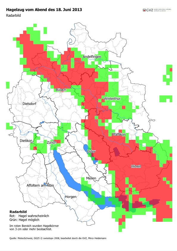 MedienmitteilungHagel verursacht grosse Gebäudeschäden im Kanton Zürich (BILD)2013-06-19T17:41:26Zürich (ots) - Gestern Abend zogen heftige Gewitter von Graubünden übers Zürcher Oberland und weiter Richtung Andelfingen und Bülach. Es wurden Hagelkorngrössen von drei, vier oder sogar fünf Zentimetern, Sturmböen, starker Regen und Blitze registriert. Ungewöhnlich war die Zugrichtung von Südosten nach Nordwesten. Siehe auch beiliegende Karte. Der GVZ Gebäudeversicherung Kanton Zürich sind bereits zahlreiche Schäden gemeldet worden. Sie rechnet mit 2'000 bis 3'000 Gebäudeschäden und schätzt derzeit eine Schadensumme von mindestens 15 Mio. CHF. Versicherungstechnisch handelt es sich um ein lokales Massenereignis. Betroffen sind vor allem die Gemeinden Wetzikon, Hinwil, Seegräben und Andelfingen. Vom Hagel beschädigt wurden vor allem Dacheindeckungen, Dachfenster, Lichtkuppeln, Sonnenkollektoren und Lamellenstoren. Präventionstipps zum Gebäudeschutz vor Hagel - Lamellenstoren einziehen. Heutiges Glas hält 5 cm grosse Hagelkörner aus. Lamellenstoren sind wesentlich empfindlicher. - Bauteile der Gebäudehülle (Dacheindeckungen, Fassade, Beschattungseinrichtungen, Sonnenkollektoren, etc.) mit Hagelwiderstand 3 oder mehr verwenden (siehe www.Hagelregister.ch). Bei Kunststoffbauteilen die Alterung beachten und rechtzeitig ersetzen. Die GVZ Gebäudeversicherung Kanton Zürich ist ein öffentliches Unternehmen des Kantons Zürich in der Form einer selbständigen öffentlich-rechtlichen Anstalt. Sie arbeitet nicht gewinnorientiert und beansprucht weder Staatsgarantie noch Steuergelder. Die GVZ versichert alle Gebäude im Kanton gegen Feuer- und Elementarschäden. Im gesetzlichen Auftrag erfüllt sie in enger Zusammenarbeit mit den Gemeinden den Brandschutz (Feuerpolizei) und das Feuerwehrwesen. Kontakt: Christian Caduff, Leiter Versicherung und Stellvertretender Direktor Permalink: