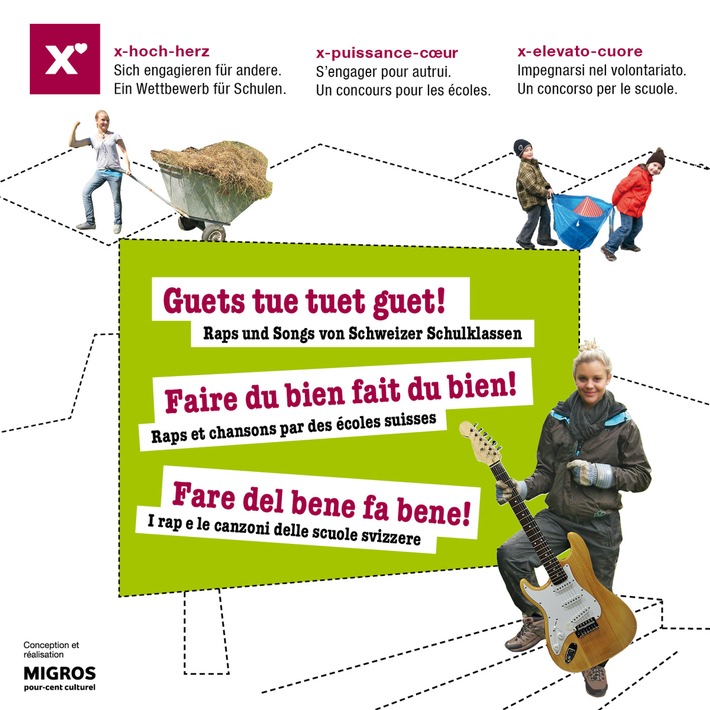 Mit seinem nationalen Schulwettbewerb x-hoch-herz 2012/2013 hat das Migros-Kulturprozent Schülerinnen und Schüler aus der Volksschule aufgefordert Songtexte zu Thema "Guets tue tuet guet!" zu schreiben. Schülerinnen und Schüler aus der ganzen Schweiz haben insgesamt 500 Raps und Songs eingereicht. Mit den Texten motivieren sie andere dazu, Gutes zu tun. Die prämierten fünfzehn Songs sind nun auf einer CD erschienen und können unter www.xhochherz.ch angehört werden.