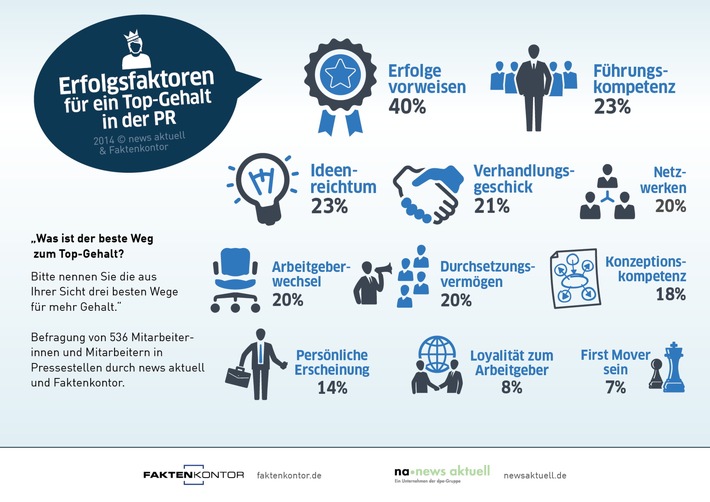 MedienmitteilungDie elf wichtigsten Faktoren für ein Top-Gehalt in der PR2014-07-07T11:24:26Hamburg (ots) - - Querverweis: Bildmaterial wird über obs versandt und ist abrufbar unter http://www.presseportal.de/galerie.htx?type=obs - Wer Erfolge vorweisen kann, Führungskompetenz zeigt und viele Ideen produziert, hat die besten Chancen, zu den Topverdienern in der PR gezählt zu werden. Persönliche Erscheinung, Loyalität zum Arbeitgeber und der Status als First Mover sind dagegen deutlich weniger wichtig. Das haben die dpa-Tochter news aktuell und Faktenkontor herausgefunden. 536 Mitarbeiterinnen und Mitarbeiter aus Pressestellen deutscher Unternehmen haben an der jüngsten Umfrage teilgenommen. Ebenfalls von großer Bedeutung für ein überdurchschnittliches Gehalt sind individuelles Verhandlungsgeschick, berufliches Netzwerken und Durchsetzungsvermögen. Loyalität zum Arbeitgeber (acht Prozent) zahlt sich nach Meinung der Kommunikationsprofis allerdings deutlich weniger aus als ein Arbeitgeberwechsel (20 Prozent). Auch eine ausgeprägte Konzeptionskompetenz, die für die Planung von erfolgreichen Kampagnen und Projekten wichtig ist, ist nach Auffassung der Befragten eher von untergeordneter Bedeutung für einen hohen Gehaltsscheck. Die elf wichtigsten Faktoren für ein Top-Gehalt in der PR: 1. Erfolge vorweisen (40 Prozent) 2. Führungskompetenz (23 Prozent) 3. Ideenreichtum (23 Prozent) 4. Verhandlungsgeschick (21 Prozent) 5. Netzwerken (20 Prozent) 6. Arbeitgeberwechsel (20 Prozent) 7. Durchsetzungsvermögen (20 Prozent) 8. Konzeptionskompetenz (18 Prozent) 9. Persönliche Erscheinung (14 Prozent) 10. Loyalität zum Arbeitgeber (acht Prozent) 11. First Mover sein (sieben Prozent) Frage: "Was ist der beste Weg zu einem Top-Gehalt? Nennen Sie die drei besten Wege für mehr Gehalt." Datenbasis: 536 Mitarbeiterinnen und Mitarbeiter aus Pressestellen Art der Befragung: Online-Befragung Befragungszeitraum: März/April 2014 Kontakt: news aktuell GmbH Permalink: