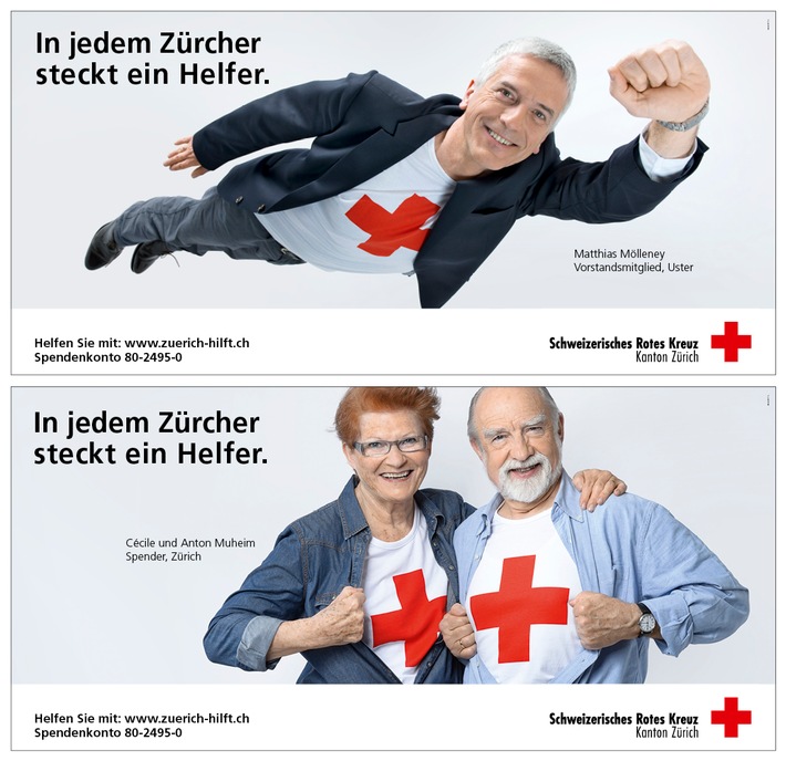 MedienmitteilungWerbekampagne des SRK Kanton Zürich: «In jedem Zürcher steckt ein Helfer» (BILD)2014-07-09T11:15:00Zürich (ots) - Matthias Mölleney, renommierter Personalexperte aus Uster, und mit ihm 13 weitere «SRK-Superhelferinnen und -helfer» sind Markenbotschafter der aktuellen Werbekampagne des Schweizerischen Roten Kreuzes (SRK) Kanton Zürich. Helfen kann jede und jeder auf einfache Art und Weise. Dies ist die Hauptbotschaft der aktuellen Kampagne des SRK Kanton Zürich. «Man muss sich einfach einen Ruck geben», wie es zwei Rotkreuz-Spendende, Cécile und Anton Muheim aus Zürich, auf den Punkt bringen. Das Zürcher Hilfswerk macht mit der Kampagne auf seine wichtige soziale und humanitäre Arbeit auf kantonaler Ebene aufmerksam. Das Fundament bilden viele treue Spenderinnen, Spender und Mitglieder sowie 2'400 Freiwillige. Matthias Mölleney, selbstständiger Personalexperte und Leiter des Center for Human Resources Management & Leadership der HWZ, ist ehrenamtliches Vorstandsmitglied des SRK Kanton Zürich. Er möchte mit seinem Engagement bei der Kampagne die Wichtigkeit und die Vielfalt der Freiwilligenarbeit aufzeigen. Die Werbekampagne umfasst unter anderem Plakate, die seit dieser Woche an ausgewählten Stellen im Kanton hängen, Onlinebanner und Füllerinserate. Alle Sujets mit den 14 Freiwilligen und Spendern sind bis Ende August zu sehen unter: www.zürichhilft.ch. Hilfe für benachteiligte Menschen im Kanton Zürich Das SRK Kanton Zürich erfüllt wichtige soziale und humanitäre Aufgaben auf kantonaler Ebene. In Form von direkter Hilfe, Beratung und Bildung unterstützt das SRK Kanton Zürich Menschen, die in schwierigen Situationen leben, sei dies altersbedingt, krankheitsbedingt oder aufgrund finanzieller oder anderer Not. Hilfe zur Selbsthilfe wird dabei gross geschrieben. In den Bereichen Gesundheit, Soziales und Migration/Asyl setzen sich rund 90 Mitarbeitende und über 2'400 Freiwillige im Kanton dafür ein, dass für Benachteiligte der Alltag ein Stück weit einfacher und leichter wird. Die breite Palette von Hilfeleistungen finanziert sich hauptsächlich durch Spenden und Mitgliederbeiträge (45 Prozent) sowie durch Leistungsaufträge (21 Prozent) und Erträge aus Dienstleistungen und Projekten (31 Prozent). Der unentgeltliche Einsatz von Freiwilligen von über 149'000 Stunden im Jahr 2013 entspricht in Form von Zeitspenden rund 4,5 Millionen Franken. Kontakt: Anita Ruchti, SRK Kanton Zürich, 044 388 25 55, Permalink: