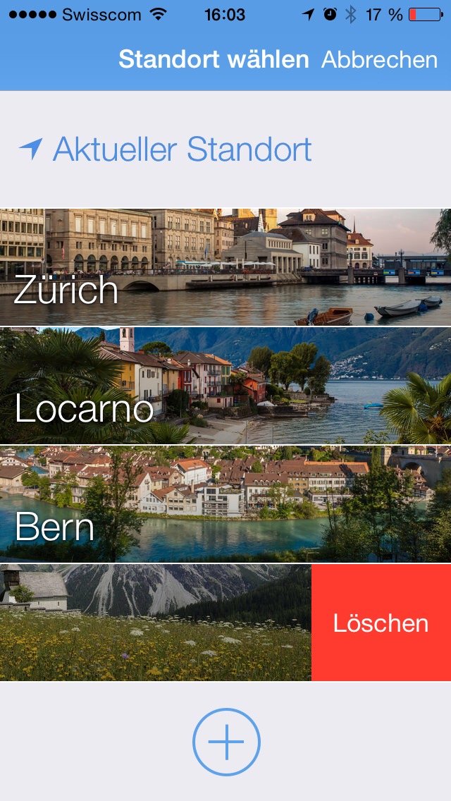 Auch die Auswahl der Städte kommt mit der neuen Version schöner und einfacher daher. Mit der neuen Darstellung kann zügig zwischen Lieblingsorten gewechselt werden. Anhand der (+) Option im unteren Bereich des Bildschirmes kann der User beliebig viele Orte hinzufügen, oder durch einfaches Wischen nach links wieder löschen.