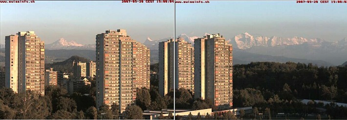 unter: http://www.presseportal.ch/de/pm/100001296/ -Das Internetportal www.swissinfo.ch hat die Aufgabe, den Bekanntheitsgrad der Schweiz im Ausland zu steigern. Neustes Instrument bei der Umsetzung dieses Auftrags ist ein Live-Panoramabild auf die Berner Alpen. Auf dem Dach des siebenstöckigen swissinfo-Hauptsitzes im Berner Ostring wurden fünf Webcams montiert und Richtung Süden ausgerichtet. Sie zeigen bei gutem Wetter das gesamte Berner Oberländer Alpenpanorama: vom Finsteraarhorn, über das Dreigestirn Eiger, Mönch und Jungfrau, die Schwalmeren, den Niesen, die Blüemlisalp bis zum Stockhorn - und zwar live. Im Vordergrund sind die Berner Vorortsquartiere Murifeld und Wittikofen zu erkennen. Die Bildschirmpräsentation geschieht im Flash-Format. Mit der Computermaus kann der Benutzer das Panoramabild von links nach rechts - und wieder zurück - bewegen. Durch einen Klick auf ein einzelnes Webcambild wird der entsprechende Ausschnitt vergrössert. Mit dieser Dienstleistung bietet www.swissinfo.ch seinen Besucherinnen und Besuchern einen einmaligen Weit- und Ausblick auf die landschaftlichen Schönheiten des Kantons Bern. Link: http://www.swissinfo.ch/flash/webcams/index.html swissinfo/Schweizer Radio International (SRI) ist eine Unternehmenseinheit der SRG SSR idée suisse (Schweizerische Radio- und Fernsehgesellschaft). Sie hat die Aufgabe, im Ausland lebende Schweizerinnen und Schweizer über die Ereignisse in ihrem Heimatland zu informieren und den Bekanntheitsgrad der Schweiz im Ausland zu steigern. Hierzu betreibt swissinfo/SRI eine News- und Informationsplattform in neun Sprachen: http://www.swissinfo.ch/. Kontakt: Peter Schibli Permalink:
