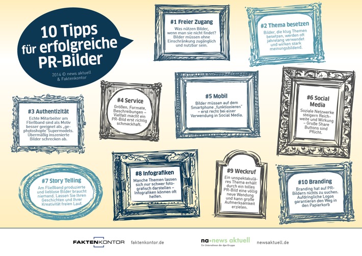 MedienmitteilungDie 10 wichtigsten Tipps für erfolgreiche PR-Bilder2014-06-17T13:30:20Hamburg (ots) - - Querverweis: Bildmaterial wird über obs versandt und ist abrufbar unter http://www.presseportal.de/galerie.htx?type=obs - Freier Zugang, Eignung für Smartphones und Verzicht auf Branding. Diese und andere Tipps zeigen, welche Faktoren dafür ausschlaggebend sind, dass PR-Bilder einen großen Widerhall in Redaktionen und im Web finden. Die dpa-Tochter news aktuell und Faktenkontor zeigen in zehn Punkten, worauf Pressesprecher und PR-Fachleute bei der Fotoproduktion achten müssen. In der heutigen schnellen Kommunikation haben Bilder einen äußerst hohen Stellenwert. Leser und Internetnutzer sind so vielen Informationsanreizen ausgesetzt wie niemals zuvor. Die Folge: Das Zeitbudget pro Information ist dramatisch gesunken. Dagegen veranschaulichen Fotos Zusammenhänge und Botschaften am schnellsten. Umso wichtiger ist es also für PR-Verantwortliche, Bildmaterial inhaltlich, technisch und organisatorisch optimal zur Verfügung zu stellen. * Freier Zugang Was nützen Bilder, wenn man sie nicht findet? Bilder müssen ohne Einschränkung zugänglich und nutzbar sein. * Thema besetzen Bilder, die klug Themen besetzen, werden oft jahrelang verwendet und wirken stark meinungsbildend. * Authentizität Der echte Mitarbeiter am Fließband ist als Motiv besser als ein "ge-photoshoptes" Supermodel. Übermäßig inszenierte Bilder schrecken ab. * Service Größen, Formate, Beschreibungen - Vielfalt macht ein PR-Bild erst richtig schmackhaft. * Mobil Bilder müssen auf dem Smartphone "funktionieren" - erst Recht bei einer Verwendung in Social Media. * Social Media Soziale Netzwerke steigern Reichweite und Wirkung - Große Share Buttons sind Pflicht. * Story Telling Am Fließband produzierte und lieblose Bilder braucht niemand. Lassen Sie Ihren Geschichten und Ihrer Kreativität freien Lauf. * Infografiken Manche Themen lassen sich nur schwer fotografisch darstellen - Infografiken können oft helfen. * Weckruf Ein unspektakuläres Thema erhält durch ein tolles PR-Bild eine völlig neue Wendung und kann große Aufmerksamkeit erzielen. * Branding schützt vor Abdruck Branding hat auf PR-Bildern nichts zu suchen. Aufdringliche Logos garantieren den Weg in den Papierkorb Die dpa-Tochter news aktuell sorgt dafür, dass Unternehmen und Organisationen mit ihren Bildern die richtigen Menschen in den Redaktionen und Fotomarktplätzen erreichen. Außerdem ist das Hamburger Unternehmen Ausrichter des PR-Bild Award. Ein Mal pro Jahr prämiert news aktuell die besten PR-Fotos des Jahres. Die Einreichungsfrist endet in diesem Jahr am 20. Juni. Die Teilnahme ist kostenlos. Einreichungen PR-Bild Award 2014: www.pr-bild-award.de Kontakt: news aktuell GmbH Permalink: