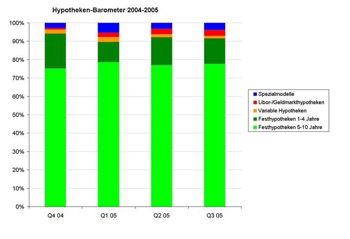 http://www.presseportal.ch/de/story.htx?firmaid=100003671 -Dies zeigt das Hypotheken-Barometer des Internet-Vergleichsdiensts comparis.ch. Für Festhypotheken mit Laufzeiten von 10 Jahren war die Nachfrage noch nie so gross wie im dritten Quartal 2005. Die durchschnittliche Laufzeit der nachgefragten Festhypotheken liegt neu bei rekordverdächtigen sechseinhalb Jahren. Auf das grösste Interesse der Hypothekar-Interessenten stiessen auch im dritten Quartal 2005 Festhypotheken: Unverändert interessierten sich 92 Prozent der Gesuchsteller in der Hypotheken-Börse des Internet-Vergleichdiensts comparis.ch für diese Form der Wohneigentumsfinanzierung. Eine Veränderung ist vor allem bei den Laufzeiten zu beobachten: 10-jährige Festhypotheken werden immer beliebter. Variable und andere Hypothekarformen bleiben wenig nachgefragt. Das Comparis-Hypotheken-Barometer (siehe Grafik unter: http://www.presseportal.ch/de/story.htx?firmaid=100003671 ) zeigt quartalsweise auf, welche Laufzeiten und Hypotheken-Arten die Interessenten nachfragen. Möglichst lange von tiefen Zinsen profitieren comparis.ch beobachtet einen deutlich verstärkten Trend, möglichst lange von den tiefen Zinsen zu profitieren. Dies drückt sich in einer Verschiebung des Interesses von 5- zu 10-jährigen Festhypotheken aus: Laufzeiten von 10 Jahren wurden beinahe gleich häufig wie Laufzeiten von 5 Jahren nachgefragt. Im September zum Beispiel lag der Anteil 10-jähriger Festhypotheken bei einem Drittel, vor einem Jahr bei einem Zehntel. Dies erstaunt nicht. Denn das Zinsniveau einer Festhypothek über 10 Jahre ist auf einem neuen Tiefststand und nun gleich hoch wie vor einem Jahr das Zinsniveau für Festhypotheken mit Laufzeiten von 5 Jahren. Der Zinsaufschlag zwischen 5- und 10-jährigen Festhypotheken betrug im dritten Quartal zudem gerade noch 0,59 Prozent. Diese Verlagerung schlägt sich auch in der durchschnittlichen Laufzeit nieder: Im dritten Quartal lag diese bei 6,4 Jahren (zweites Quartal: 5,8 Jahre). Vor einem Jahr lag die durchschnittliche Dauer erst bei knapp 5 Jahren. Die Hypothekar-Anbieter reagierten bereits auf die verstärkte Nachfrage nach längeren Laufzeiten. Immer mehr Banken und Versicherungen bieten 10-jährige Festhypotheken an. Seit kurzem gibt es bei einigen Anbietern sogar Laufzeiten bis zu 15 Jahren. Daten stammen von der Hypotheken-Börse von comparis.ch Für das Hypotheken-Barometer werden die Gesuche ausgewertet, welche die Hypothekar-Suchenden in der Hypotheken-Börse von comparis.ch eingeben. Dort können Interessenten ihr Finanzierungsgesuch anonym platzieren und erhalten online Angebote von Banken und Versicherungen. Die Hypotheken-Börse von comparis.ch ist ein ideales Instrument für die einfache und zeitsparende Suche nach einer massgeschneiderten Hypothek. Kontakt: Martin Scherrer Permalink: