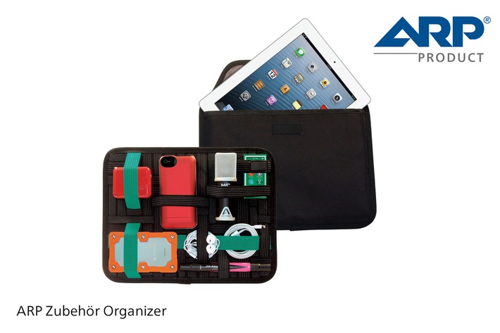 MedienmitteilungMobile Working: ARP Zubehör Organizer schafft Ordnung unterwegs (BILD)2014-08-21T20:30:16Rotkreuz (ots) - Mobiles Arbeiten bringt eine Menge Vorteile, führt aber auch dazu, dass man häufig viele verschiedene Zubehörprodukte mit sich trägt. Der ARP Zubehör Organizer bringt Ordnung ins Chaos. Er ist ab sofort in drei Grössen erhältlich. Nicht nur Geschäftsreisende kennen das Problem: Um auch unterwegs arbeiten zu können, hat das Notebook inzwischen einen Stammplatz im Reisegepäck. Das Smartphone ist sowieso immer mit dabei und auch das Tablet findet immer häufiger den Weg in den Koffer. Damit ist es aber in der Regel nicht getan. Um effizient arbeiten zu können, müssen auch diverse Zubehörartikel eingepackt werden: Netzteile, USB-Sticks, Mäuse, externe Festplatten und verschiedene Kabel. So sehr man sich auch um Ordnung im Gepäck bemüht; je mehr man dabei hat, desto schneller herrscht Chaos. Der ARP Zubehör Organizer hilft, das Chaos zu beseitigen und beendet die Zeiten des endlosen Stöberns nach digitalen Geräten. Das praktische Organisationssystem besteht aus einem flachen, robusten Körper, auf den mehrere elastische Riemen gespannt sind. Die rutschfesten Riemen halten sämtliche ihnen anvertraute Artikel in Position. Dank der universell angeordneten Riemen können unterschiedlichste Artikel in beinah unbegrenzten Kombinationen daran befestigt werden. Das System ist so kompakt, dass es in fast jede Tasche, Schublade oder Notebookhülle passt. Erhältlich ist der ARP Zubehör Organizer in drei Grössen: Klein (235 x 184 x 10 mm), Gross (305 x 203 x 10 mm) und als Zubehör Organizer mit Tablet Tasche (305 x 240 x 27.5 mm). Das grosse Modell verfügt auf der Rückseite über ein per Reisverschluss schliessbares Fach für Kleinstartikel oder Dokumente. Der Zubehör Organizer mit Tablet Tasche ist gleichzeitig eine Hülle für 10-Zoll Tablets wie das iPad Air oder das Samsung Galaxy Tab 10.1. Die ARP Zubehör Organizer (Art.-Nr.: 5021613, 5021614 & 5021615) sind ab sofort zu Preisen zwischen CHF 29.- und CHF 39.- im ARP Online-Shop erhältlich. Dort findet man auch sämtliche technischen Spezifikationen sowie die aktuelle Verfügbarkeit. Kontakt: ARP Gruppe: Permalink: