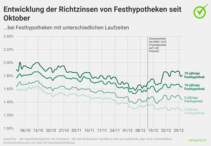 MedienmitteilungMedienmitteilung: Trotz Zinsschritt: Die hohe Nachfrage nach langlaufenden Festhypotheken bleibt ungebrochen2025-01-09T00:30:33Medienmitteilung Comparis-Hypothekenbarometer für das 4. Quartal 2024 Trotz Zinsschritt: Die hohe Nachfrage nach langlaufenden Festhypotheken bleibt ungebrochen Die Schweizerische Nationalbank (SNB) hat im Dezember erwartungsgemäss den Leitzins gesenkt. Unerwartet war jedoch die Höhe: Mit einem Zinsschritt von 0,5 Prozentpunkten halbierte sie den Leitzins von 1 Prozent auf 0,5 Prozent. Damit verbilligten sich Saron-Hypotheken markant und sind nur noch gegenüber Festhypotheken mit mittlerer Laufzeit teurer. 10-jährige Festhypotheken wurden zuletzt für durchschnittlich rund 1,1 bis 1,7 Prozent angeboten, während Saron-Hypotheken nach der Zinssenkung um die 1,1 bis 1,6 Prozent kosteten. 5-jährige Festhypotheken wurden um die 1,0 bis 1,5 Prozent gehandelt. Im 4. Quartal waren trotzdem langlaufende Festhypotheken weiter stark gefragt. «4 von 5 Hypothekarnehmenden entschieden sich für langlaufende Festhypotheken. Neben hoher Planungssicherheit dürften attraktive Konditionen zu diesem Entscheid beigetragen haben», sagt Comparis-Finanzexperte Dirk Renkert. Zürich, 9. Januar 2025 – Die Schweizerische Nationalbank (SNB) hat im Dezember erwartungsgemäss den Leitzins gesenkt. Unerwartet war jedoch die Höhe der Anpassung: Mit einem Zinsschritt von 0,5 Prozentpunkten halbierte sie den Leitzins von 1 Prozent auf 0,5 Prozent. Es war die vierte Leitzinssenkung in Folge. Anfang des Jahres betrug der Leitzins noch 1,75 Prozent. Die SNB liegt in ihrem Zinssenkungszyklus deutlich vor der Europäischen Zentralbank (EZB) und der US-Notenbank (Fed), die beide ihre Leitzinsen um 0,25 Prozentpunkte auf 3 Prozent respektive 4,25 bis 4,50 Prozent reduzierten. Während die Eurozone unter konjunktureller Schwäche grosser Mitgliedsländer wie Deutschland leidet, zeigt sich die US-Wirtschaft sehr robust. Die Zinspolitik hängt massgeblich von der Entwicklung der Inflation ab. Während sich die Inflation in der Schweiz schon seit Monaten deutlich unter 1 Prozent zeigt, ist sie in der Eurozone und in den USA zuletzt wieder leicht angestiegen und liegt oberhalb der angestrebten 2 Prozent. «Bei ihrem Zinsentscheid signalisierte die Fed, dass sich die Inflation hartnäckiger zeigt als ursprünglich erwartet. Auch ist nicht klar, wie sich die angekündigte Zollpolitik der neuen Regierung auf die Preise auswirken wird. Daher kündigte sie eine vorsichtigere Gangart bei den Zinssenkungen im nächsten Jahr an. Der US-Dollar hat sich daher gegenüber dem Franken wieder etwas aufgewertet», kommentiert Comparis-Finanzexperte Dirk Renkert. Zinsschritt der SNB schwächt Franken «Mit ihrem Entscheid, den Leitzins um 0,5 Prozentpunkte auf 0,5 Prozent zu senken, setzte die SNB ein deutliches Zeichen», so Renkert weiter. Die SNB sehe die grössere Gefahr für die konjunkturelle Entwicklung in zu niedrigen Preisen. Konsumierende könnten sich, in Erwartung weiter fallender Preise, bei ihren Kaufentscheiden zurückhalten, was zu Umsatzeinbussen bei den betroffenen Firmen führen würde. «Massgebliche Ursachen für die niedrige Inflation waren ein starker Franken und sinkende Energiepreise», sagt der Comparis-Finanzexperte. Zudem werde erwartet, dass bereits angekündigte Strompreissenkungen in Höhe von durchschnittlich 10 Prozent und sinkende Hypothekarzinsen zu einer Entspannung bei den Bestandsmieten führen und damit die Inflation sinkt. «Ein starker Franken ist für die SNB Segen und Fluch zugleich – nützte ein starker Franken bei der Bekämpfung hoher Inflation, da er die importierten Waren verbilligte, wird er in Zeiten zu niedriger Inflation als Manko angesehen. Es hat fast den Anschein, als wolle die SNB mit ihrem Zinsschritt um jeden Preis die Frankenstärke brechen», meint Renkert. Festhypotheken verbilligen sich weiter In Erwartung weiter fallender Zinsen vergünstigten sich Festhypotheken auch im 4. Quartal. Die von über 30 Kreditinstituten öffentlich publizierten Referenzzinsen (sogenannte Richtzinsen) für 10-jährige Festhypotheken lagen bei 1,63 Prozent (Stand 31. Dezember) und damit um 0,18 Prozentpunkte deutlich niedriger gegenüber Ende September mit 1,81 Prozent. Der Richtsatz für 5-jährige Festhypotheken notierte bei 1,44 Prozent (Stand per 31. Dezember) und 0,24 Prozentpunkte geringer als Ende September mit 1,68 Prozent. Anfang 2024 lagen die Richtsätze für 10-jährige und 5-jährige Festhypotheken mit 2,26 Prozent respektive 2,12 Prozent um 0,63 Prozentpunkte respektive 0,68 Prozentpunkte höher gegenüber Ende Dezember. Auch die Rendite für 10-jährige Bundesobligationen lag Ende Dezember bei 0,32 Prozent und 0,34 Prozentpunkte tiefer gegenüber 0,66 Prozent Anfang des Jahres. Festhypotheken mit mittlerer Laufzeit immer noch günstiger als Saron-Hypotheken Saron-Hypotheken haben sich nach den 4 Leitzinssenkungen in diesem Jahr um rund 1,25 Prozentpunkte vergünstigt. Damit notieren sie zwar noch teurer als Festhypotheken mit mittlerer Laufzeit, jedoch leicht günstiger als Festhypotheken mit 10-jähriger Laufzeit. Die gehandelten Spannen bewegen sich im Dezember wie folgt: Erstrangige Saron-Hypotheken kosten im Durchschnitt um die 1,1 bis 1,6 Prozent, 5-jährige Festhypotheken um die 1,0 bis 1,5 Prozent, 10-jährige Festhypotheken werden um die 1,1 bis 1,7 Prozent gehandelt. «Mit dem Zinsschritt um 0,5 Prozentpunkte haben sich Saron-Hypotheken markant vergünstigt. Zwar sind schon vorher auch die Richtzinsen für Festhypotheken gesunken, aber nicht ganz so stark. Dennoch notieren Festhypotheken auf einem sehr attraktiven Stand. Wer Planungssicherheit zu attraktiven Konditionen sucht, ist mit Festhypotheken gut bedient. Wer das Zinsänderungsrisiko tragen kann und an weiter fallende Zinsen glaubt, für den sind Saron-Hypotheken vermutlich eher geeignet», meint Renkert. Anteil von langlaufenden Festhypotheken bei fast 80 Prozent Bei den A