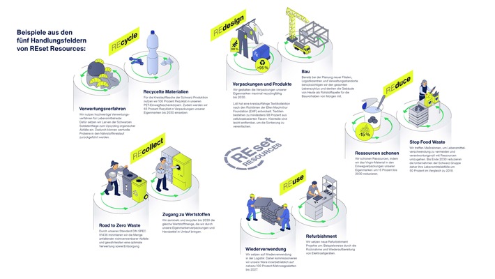In Zeiten geopolitischer Spannungen und sich polarisierender Gesellschaften setzen die Unternehmen der Schwarz Gruppe auf Verlässlichkeit, Partnerschaft und Transparenz. Als eine der größten Handelsgruppen der Welt nehmen sie ihre Verantwortung gegenüber Umwelt, Gesellschaft und Politik wahr. In ihrem gemeinsam erstellten Nachhaltigkeitsbericht für das Geschäftsjahr 2024 zeigen sie messbare Erfolge in den Bereichen Umwelt, Soziales und Governance (ESG) und präsentieren unter anderem die ganzheitliche Kreislaufwirtschaftsstrategie REset Resources sowie ihren gruppenweiten Fortschritt auf dem Weg zu Net-Zero. REset Resources: Fünf Handlungsfelder für gelebte Kreislaufwirtschaft Kreislaufwirtschaft ist ein elementarer Teil des Nachhaltigkeitsengagements und somit auch des aktuellen, gemeinsam erstellten Nachhaltigkeitsberichts der Unternehmen der Schwarz Gruppe: So wurden im Geschäftsjahr 2024 vom gruppenweiten Gesamt-Abfall 88,6 Prozent recycelt, wiederverwendet, vergärt, kompostiert oder als Tierfutter eingesetzt. Gemeinsam setzen sich die Unternehmen der Schwarz Gruppe nun ambitionierte Ziele und entwickeln ihre Plastikstrategie REset Plastic zur ganzheitlichen Kreislaufwirtschaftsstrategie REset Resources weiter. Entlang der fünf Handlungsfelder REdesign, REduce, REuse, REcollect und REcycle prägt REset Resources den Ressourcenumgang innerhalb der Schwarz Gruppe über sämtliche Sparten und Länder hinweg. Ab sofort bekennen sich die Unternehmen der Schwarz Gruppe gemeinsam zu folgenden Leitsätzen und Verpackungszielen, die erstmalig sämtliche Verpackungsarten und -materialien einbeziehen: REset Resources (Handlungsfelder | Leitsätze | Verpackungsziele):