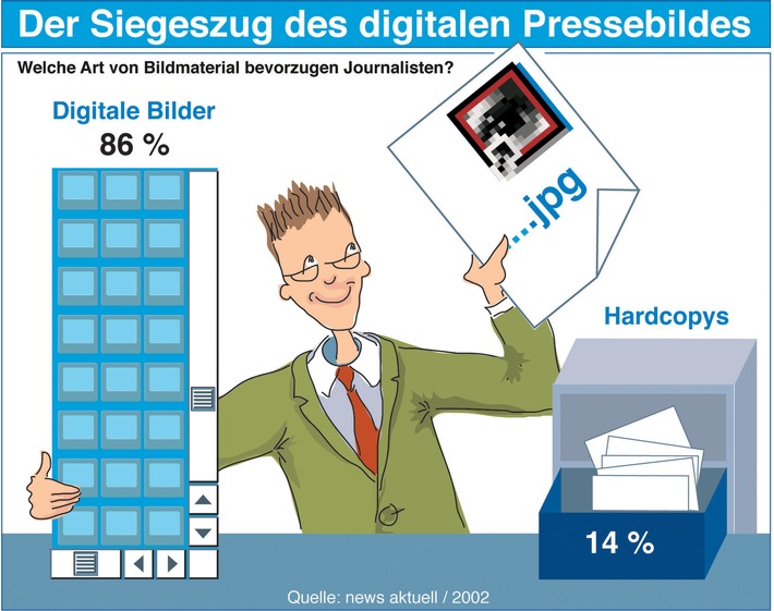 Medienmitteilungmedia studie 2002: Journalisten bevorzugen digitale Pressebilder2002-12-06T13:01:46Hamburg (ots) - Querverweis auf Grafik: www.newsaktuell.ch/d/galerie.htx?type=ogs Digitale Bilder sind heute das bevorzugte Arbeitsmaterial von Fotoredaktionen. 86 Prozent von ihnen geben Bilddateien den Vorzug. Nur 14 Prozent wollen noch mit Fotoabzügen (Hardcopy) beliefert werden. Das zeigt die media studie 2002 "Journalisten online" von news aktuell. Die dpa-Tochter wertete zusammen mit dem Marktforschungsinstitut dpm-Team die Antworten von mehr als 700 Journalisten zu Internetnutzung, E-Mail, Pressearbeit und digitalem Fotomaterial aus. Obwohl digitale Pressebilder generell bevorzugt werden, sind bei den Journalisten verschiedener Mediengattungen Unterschiede festzustellen: Redakteure von Wochen- und Fachzeitschriften sind dem analogen Foto deutlicher zugeneigt als der Durchschnitt. Sie bevorzugen zu knapp einem Viertel die Hardcopy (23 Prozent). Ihre Kollegen von Tageszeitungen und Nachrichtenagenturen dagegen sprechen sich überdurchschnittlich oft für digitale Bilder aus (87 Prozent). Jüngere Journalisten unter 30 Jahren wollen sogar zu 93 Prozent mit digitalem Bildmaterial beliefert werden. Unterschiede gibt es auch bei den einzelnen Ressorts, in denen die Befragten arbeiten. Unter den Journalisten von Politik, Computer und aus dem Lokalen hat sich die digitale Fototechnik fast vollständig durchgesetzt. Gut 90 Prozent der Befragten sprechen sich dafür aus. Dagegen bleibt ein Drittel der Tourismus-Redakteure dem klassischen Papierbild treu. Die Journalisten aus den Ressorts Gesundheit, Service und Kultur plädieren immerhin noch zu knapp einem Viertel für Hardcopys. Ein Grund dafür, dass Journalisten digitale Pressebilder bevorzugen, ist die Möglichkeit, diese in elektronischen Bilddatenbanken zu archivieren. Rund drei Viertel der befragten Journalisten setzt mittlerweile auf die digitale Speicherung. Nur in ungefähr jeder sechsten Redaktion werden die Bilder weiterhin in Papierform archiviert. Bei den tagesaktuelle Medien setzen überdurchschnittliche 80 Prozent auf die Vorteile von digitalen Bilddatenbanken. Bei Wochen- und Fachzeitschriften dagegen greift fast ein Viertel noch auf ein traditionelles Papierarchiv zurück. Die komplette media studie 2002 ist für EUR 150,00 über news aktuell zu beziehen. Eine Zusammenfassung der Ergebnisse ist unter www.newsaktuell.de zu finden. Die Freehand-Version der Grafik kann bei news aktuell unter Tel. +49-(0)40-4113-2589 angefordert werden. Kontakt: news aktuell GmbH Permalink: