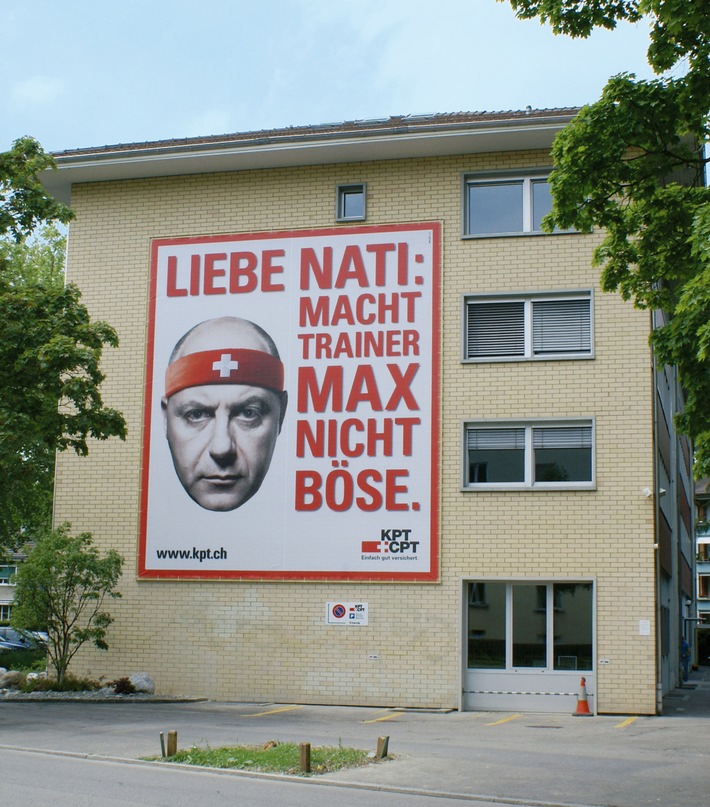 unter: http://www.presseportal.ch/de/pm/100003789 -In unmittelbarer Nähe des Stade de Suisse, am Hauptsitz der KPT an der Tellstrasse, prangt seit dem 23. Mai eine riesige Botschaft an die Schweizer Fussball-Nationalmannschaft. Auf 7 mal 8 Metern Fläche äussert sich jedoch nicht Trainer Kuhn, sondern Trainer Max zu den bevorstehenden Spielen der Euro 08. Seine Botschaft ist klar: Max will Siege sehen. Sonst wird er böse. Sehr böse. Trainer Max berät übrigens nicht nur die Nati, sondern auch gegen 11'000 Personen, die sich seit letztem Herbst zum kostenlosen Coaching auf www.einzeltraining.ch angemeldet haben. Am gleichen Tag gewann die Max-Kampagne der KPT Versicherung den Schweizerischen Dialogmarketing-Preis in Platin als beste aller eingereichten Arbeiten. Kontakt: Reto Egloff, Mitglied der Geschäftsleitung Permalink: