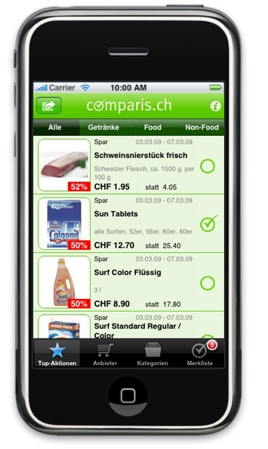 Medienmitteilungcomparis.ch: iPhone-Applikation für Aktionen und Sonderangebote - Das iPhone wird zum Radar für Aktionen2009-03-30T15:41:40Zürich (ots) - Information: Das Bild der neuen Comparis-Applikation «Aktionen» für das iPhone kann unter www.presseportal.ch/de/pm/100003671 kostenlos heruntergeladen werden. Mit dem Markteintritt von Lidl ist das Angebot an Detailhändlern grösser geworden. Schwieriger hingegen wird es für die Konsumenten, die Übersicht über Aktionen und Sonderangebote zu behalten. Der Internet-Vergleichsdienst comparis.ch hat die kostenlose Software «Aktionen» für das iPhone oder den iPod Touch lanciert. Mit einem Tipp auf den Bildschirm lassen sich sämtliche Aktionen und Sonderangebote von Migros, Coop, Denner, Spar, Volg, Aldi und Lidl abrufen. Mit der kostenlosen Software «Aktionen» des Internet-Vergleichsdiensts comparis.ch für das iPhone oder den iPod Touch lassen sich in Sekundenschnelle alle Top-Aktionen und Sonderangebote der gängigen Detailhändler finden. Schnell, mobil, nur mit einem «Touch» erscheinen alle aktuellen Sonderangebote und Aktionen auf dem iPhone-Bildschirm. Ralph Weber, Produkt Manager bei comparis.ch: «Die Detailhandelslandschaft hat sich seit dem Markteintritt von Aldi gehörig gewandelt. Jetzt, da Lidl ebenfalls in der Schweiz Fuss gefasst hat, wird der Ton unter den Discountern noch schärfer. Dadurch entsteht mehr Wettbewerb und die Konsumentinnen und Konsumenten profitieren von tieferen Preisen. Gleichzeitig wird es aber auch immer schwieriger, die Übersicht zu behalten, wo welche Produkte im Sonderangebot zu finden sind.» In der Comparis-Applikation «Aktionen» erscheinen die Sonderangebote geordnet nach der Höhe des Rabatts. Die «Top-Aktionen» - jene mit dem grössten Rabatt - erscheinen zuoberst auf dem Bildschirm. Sonderangebote und Aktionen lassen sich auf einer Merkliste speichern und, wenn gewünscht, per E-Mail versenden. Dank den verschiedenen Kategorien «Getränke», «Food» und «Non-Food» ist es ausserdem möglich, die Suche gezielt auf die persönlichen Bedürfnisse auszurichten. Mit der Kartenfunktion lässt sich die eigene Position und der nächstgelegene Detailhändler ermitteln. Wer über Sonderangebote und Aktionen informiert werden will, kann dies mit dem tagesaktuellen Aktionenfinder von comparis.ch schnell und einfach tun. Ralph Weber sieht in der Applikation eine bequeme Sparmöglichkeit: «Wer von Aktionen profitieren möchte, braucht nicht mehr alle Detailhändler einzeln abzuchecken. Dies spart viel Zeit, Nerven und Geld.» Sonderangebote gratis finden Das iPhone oder den iPod Touch kann man mit der Gratis-Software «Aktionen» von comparis.ch direkt über den App Store fit machen. Alternativ kann die Software via Computer auf die beiden mobilen Geräte übertragen werden. Voraussetzung ist, dass iTunes von Apple auf dem PC oder dem Mac installiert ist. Bilder der Applikation können bei media@comparis.ch bestellt werden. Kontakt: Ralph Weber Permalink: