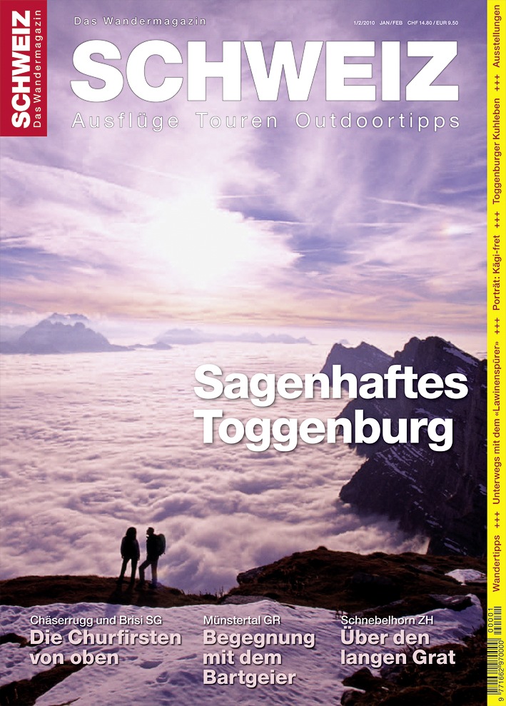unter: http://www.presseportal.ch/de/pm/100003502 -Toggenburg: Hinter den sieben Bergen Kein Märchen ist, dass die Zähne der sieben Churfirsten das weit herum sichtbare Markenzeichen des Toggenburg sind. Ausserdem, dass es zu deren Füssen Donnerlöcher, Höhlenbärenknochen, eine uralte Käsesorte und jede Menge tollster Wanderziele gibt. Dass hier einst aber auch Drachen, wilde Mannli und andere seltsame Gestalten gehaust haben sollen, ist schon eher dem Reich der Legenden zuzuordnen. Tatsächlich ist die neueste Ausgabe des Wandermagazins SCHWEIZ «eine sagenhafte Nummer». Nicht nur, weil das märchenhafte Tal der Thur zwischen Wil und Wildhaus das grosse Thema ist. Sondern auch, weil sie bei den Leserinnen und Lesern Kindheitserinnerungen an einen sinnlichen Knuspersnack weckt. Und weil sich die Redaktoren mit einem «Lawinenspürer» durch die frisch verschneiten Steilhänge eines Walliser Wintersportortes gewühlt haben. Alles wie immer hervorragend fotografiert und dokumentiert. Die Ausgabe «Toggenburg» des Wandermagazins SCHWEIZ ist ab sofort an allen grossen Kiosken erhältlich oder direkt beim Rothus Verlag, Telefon 032 623 16 33, wandermagazin@rothus.ch. Preis: CHF 14.80. Touren im Internet 5000 Wanderideen, Ski- und Schneeschuhtouren sind im Internetportal des Wandermagazins SCHWEIZ www.tourenfinder.ch gratis verfügbar. Alle Touren sind mit ausführlichen Wegbeschreibungen, Schwierigkeitshinweisen, Höhenprofilen, Fotogalerien, detaillierten Karten, Webcam, SBB Fahrplänen sowie GPS-Daten zum freien Download ergänzt. Tourenfinder.ch ist das grösste und umfassendste Internet-Wanderportal für die Schweiz und das grenznahe Ausland Download Titelseite und Medienmitteilung des aktuellen Wandermagazins SCHWEIZ: http://www.wandermagazin.ch/index.php?menuid=59 Kontakt: Rezensionsexemplare und weitere Infos: Permalink: