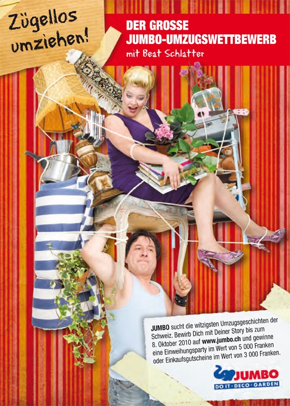 unter: http://www.presseportal.ch/de/pm/100001796 -Beat Schlatter und JUMBO suchen Euch. Seid Ihr die kreativsten, witzigsten Zügler von morgen? Dann beweist es uns! Bei einem Umzug kann eine Menge passieren. Nicht alles ist voraussehbar. Habt auch Ihr diese Erfahrungen gemacht? Komische Umzugshelfer, vergessen die Türen auszumessen, oder gar in die falsche Wohnung eingezogen? Oder habt Ihr den Umzug noch vor Euch? Dann wollen wir das wissen! JUMBO sucht die witzigsten Umzugsgeschichten der Schweiz. Bewerbt Euch jetzt mit Eurer Story und gewinnt eine Einweihungsparty im Wert von 5000 Franken oder Einkaufsgutscheine im Gesamtwert von 3000 Franken. So seid Ihr dabei Der Online-Umzugswettbewerb von JUMBO startet heute. Mitmachen dürfen alle, die anstelle eines professionellen Umzugsteams mit Hilfe von Freunden, Bekannten oder Verwandten umziehen und deren Wohnsitz in der Schweiz ist. Was müsst Ihr dafür tun? Einfach Eure witzigsten Erlebnisse der Umzugsaktion in einem Video festhalten oder mit Hilfe von acht Fotos dokumentieren und auf www.jumbo.ch hochladen. Pro Bild oder Video kann eine kurze Beschreibung angefügt werden und das ganze kann abschliessend mit einem ausführlichen Bericht ergänzt werden. Einsendeschluss ist der 8. Oktober 2010, 12.00 Uhr. Das Volk und die härteste aller Fachjury bestimmen den Gewinner Macht Werbung in eigener Sache und mobilisiert Eure Freunde zum abstimmen. So erhöht Ihr die Chance aufs Finale und Euer Projekt wird von unserer harten Fachjury, bestehend aus Beat Schlatter (Komiker, Schauspieler), Malu Barben (Fotografin, Künstlerin) und Jérôme Gilg (CEO Jumbo-Markt AG) geprüft. Deine Stimme wird belohnt. Unter allen Voting-Teilnehmern verlosen wir zusätzlich Einkaufsgutscheine im Wert von 1500 Franken. Jeder Voting-Teilnehmer hat maximal drei Stimmen zur Verfügung. Pro Projekt kann nur eine Stimme abgegeben werden. Unter allen Einsendungen schaffen es die fünf Besten in die Endrunde. Alle Finalisten finden Sie unter www.jumbo.ch ab dem 23.10.2010. Am 5.11.2010 erfolgt dann die Bekanntgabe der drei Gewinner. Beat Schlatter besucht den Gewinner des ersten Preises persönlich. Kontakt: Jumbo-Markt AG Permalink: