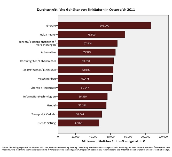 MedienmitteilungAktuelle Gehaltsstudie: Einkäufer in der Energiebranche in Österreich verdienen am besten2012-02-07T09:15:13Wien (ots) - - Querverweis: Bildmaterial wird über obs versandt und ist abrufbar unter http://www.presseportal.de/galerie.htx?type=obs - Einkäufer in der Energiebranche in Österreich verdienen im Durchschnitt 106.00 Euro im Jahr - und lassen damit andere Branchen weit hinter sich. In der Holz- und Papierindustrie verdienen Einkäufer im Durchschnitt 77.000 Euro. Die Auto- und Pharmabranche sowie die Maschinenbauer vergüten ihre Einkäufer im Durchschnitt mit 65.000 Euro. Schlusslicht ist der Dienstleistungssektor: Einkäufer erhalten ein durchschnittliches Jahresgehalt von 47.000 Euro. Das hat die erste Österreichische Einkäufergehaltsstudie ergeben, die von der Personalberatung Penning Consulting, den Einkaufsspezialisten von Kerkhoff Consulting und dem Forum Einkauf des Österreichischen Produktivitäts-und Wirtschaftlichkeits-Zentrums (ÖPWZ) durchgeführt worden ist. Befragt worden sind 175 österreichische Unternehmen aller Industrien und Größen im Jahr 2011. "Für Unternehmen in Österreich gab es bisher kein Benchmark, mit dem sie die Möglichkeit hatten, ihre Einkäufer gehaltlich einzuordnen", sagt Bibiane Sibera vom Forum Einkauf des ÖPWZ. "Sie wussten nicht: Vergüte ich marktgerecht? Zahle ich zu viel oder zahle ich zu wenig? Darum hat das ÖPWZ gemeinsam mit Penning Consulting und Kerkhoff Consulting zum ersten Mal die Durchschnittsgehälter von Einkäufern in Österreich erhoben." "Die Branche bestimmt die Verdienstmöglichkeiten im Einkauf", sagt Stephan Penning, Geschäftsführender Gesellschafter der Personalberatung Penning Consulting und Autor des Buchs "Personal im Einkauf" (Verlag Wiley-VCH 2010). "Aber auch die Größe des Unternehmens und die Höhe des Einkaufsvolumens beeinflussen maßgeblich die Vergütung von Einkäufern in Österreich." Die Studie belegt: Einkaufsleiter großer Unternehmen mit einem Umsatz von mehr als 100 Mio. Euro werden signifikant höher vergütet. Sie erhalten rund 40 Prozent mehr Gehalt als ihre Kollegen in Unternehmen mit weniger als 100 Mio. Euro Umsatz. Das durchschnittliche jährliche Gehalt von Einkaufsleitern aller Branchen in Österreich betrug im vergangenen Jahr 82.000 Euro. "Trotz der eindeutigen Korrelation von Unternehmensgröße und Gehalt werden die Spitzengehälter bei den Befragten jedoch nicht ausschließlich bei den größten Unternehmen bezahlt", sagt Penning. "Aufgrund von flachen Hierarchien und der Möglichkeit, somit schnell Verantwortung zu übernehmen, zahlen auch Unternehmen mit 100 bis 250 Mitarbeitern Spitzengehälter." Zudem ist die Gehaltsschere bei Spezialisten oder erfahrenen Sachbearbeitern bei großen und kleinen Unternehmen nicht so groß, wie bei Führungskräften. So beziehen zum Beispiel "Strategische Einkäufer" bei großen Unternehmen durchschnittlich nur 20 Prozent mehr Gehalt. Nur ein Drittel der Einkäufer in Österreich erhalten neben ihrem Grundgehalt eine variable Vergütung. Auch bei den Führungskräften, den Einkaufsleitern, hat gerade jeder Zweite eine Bonusvereinbarung. Bei Einkaufsleitern kleiner Unternehmen sind es sogar nur 41 Prozent. Ihr durchschnittlicher Bonus liegt bei rund 4.000 Euro. Einkaufsleiter von großen Unternehmen mit mehr als 100 Mio. Euro Jahresumsatz erhalten im Durchschnitt das Vierfache als variablen Gehaltsbestandteil. "Einkäufer werden nicht ausreichend motiviert, einen exzellenten Job zu machen", sagt Stephan Penning. "Überraschend ist sowohl die niedrige Quote der Einkaufschefs, die überhaupt ein variables Gehalt bekommen, als auch die geringe Höhe der Boni. High Potentials können so nur schwer für eine Karriere im Einkauf begeistert werden." Auch die Bemessungsgrundlage der Boni spornt nicht zu Höchstleistungen an. Nur ein Viertel des Bonus lässt sich durch Individualziele erreichen. 36 Prozent des Bonus werden fällig beim Erreichen der Unternehmensziele, 27 Prozent beim Erreichen der Bereichsziele und 12 Prozent beim Erreichen der Teamziele. "In österreichischen Einkaufsabteilungen gibt es aktuell kaum differenzierte Vergütungssysteme auf Basis spezifischer Steuerungs- und Messgrößen", sagt Gundula Jäger, Geschäftsführerin des Wiener Büros der Einkaufsberatung Kerkhoff Consulting. "Das liegt aber auch daran, dass österreichische Unternehmen auch heute noch immer nicht über ausreichende kennzahlengestützte Systeme für die Erfolgsmessung von Einkaufsabteilungen verfügen. Hier haben die Unternehmen dringenden Nachholbedarf." Im Gegensatz zu den Kollegen im Vertrieb werden Einkäufer in Österreich schlecht motorisiert. Nur 17 Prozent der Befragten verfügen über ein Firmenfahrzeug. Selbst die Einkaufsleiter können häufig nicht auf ein Fahrzeug ihres Arbeitgebers hoffen. Nur zwei von fünf Einkaufsleitern haben ein Firmenauto. Auch sonstige Zusatzleistungen gibt es nur für wenige Einkäufer: Knapp ein Fünftel erhält eine vom Arbeitgeber finanzierte Pensionsvorsorge, acht Prozent haben eine private Unfallsversicherung seitens des Arbeitgebers, eine Krankenzusatzversicherung nur vier Prozent. Vor allem Eltern werden im Einkauf wenig unterstützt: Nur ein Prozent der Befragten erhält einen Zuschuss für die Kinderbetreuung. "Einkäufer verdienen, auch unter Berücksichtigung des Gesamtpaktes mit Boni und Zusatzleistungen, im Vergleich häufig immer noch signifikant schlechter als Mitarbeiter in anderen betriebswirtschaftlichen Disziplinen", sagt Personalberater Stephan Penning. "Dies ist dadurch zu erklären, dass der Einkauf - trotz seines enormen Einflusses auf das Unternehmensergebnis - viele Jahre nicht als ernsthafte Management-Disziplin betrachtet wurde", sagt Gundula Jäger. "Aktuell findet aber ein Paradigmenwechsel statt. Die Unternehmenslenker haben erkannt, wie wichtig ein optimal geführter Einkauf für den Ertrag ihrer Firmen ist. Dies haben sie nicht zuletzt in der Wirtschaftskrise im Jahr 20