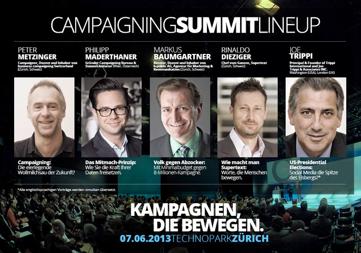 "Wirksame Kampagnen, die bewegen" stehen im Mittelpunkt des ersten Campaigning Summit Zurich am 7. Juni 2013 im Technopark Zürich. "Die alles entscheidende Frage lautet: Was bewegt Menschen dazu, aktiv zu werden und sich für eine Sache zu engagieren? Egal ob für eine Marke, ein soziales, gesellschaftliches oder politisches Anliegen, ein gemeinsames Interesse oder schlicht für eine Idee. Wer es schafft, Menschen ins Boot einer Kampagne zu holen, ist klar im Vorteil", bringt Philipp Maderthaner, Summit-Initiator und Gründer des Campaigning Bureau Vienna das Konzept auf den Punkt. Fünf nationale und internationale Speaker sollen diese Frage beantworten. Aus den USA: Joe Trippi, der Social Media Campaigning Pionier der US-Präsidentschaftswahlen. Joe Trippi schaffte es 2003 via Social Media in nur einem Jahr 640'000 aktive Wahlkampfhelfer und 50 Mio. USD Kleinstspenden für den unbekannten Kleinstaaten-Gouverneur Howard Dean zu generieren. Mit seiner Strategie und seinen Tools legte er den Grundstein für den späteren Wahlerfolg von US-Präsident Barack Obama.