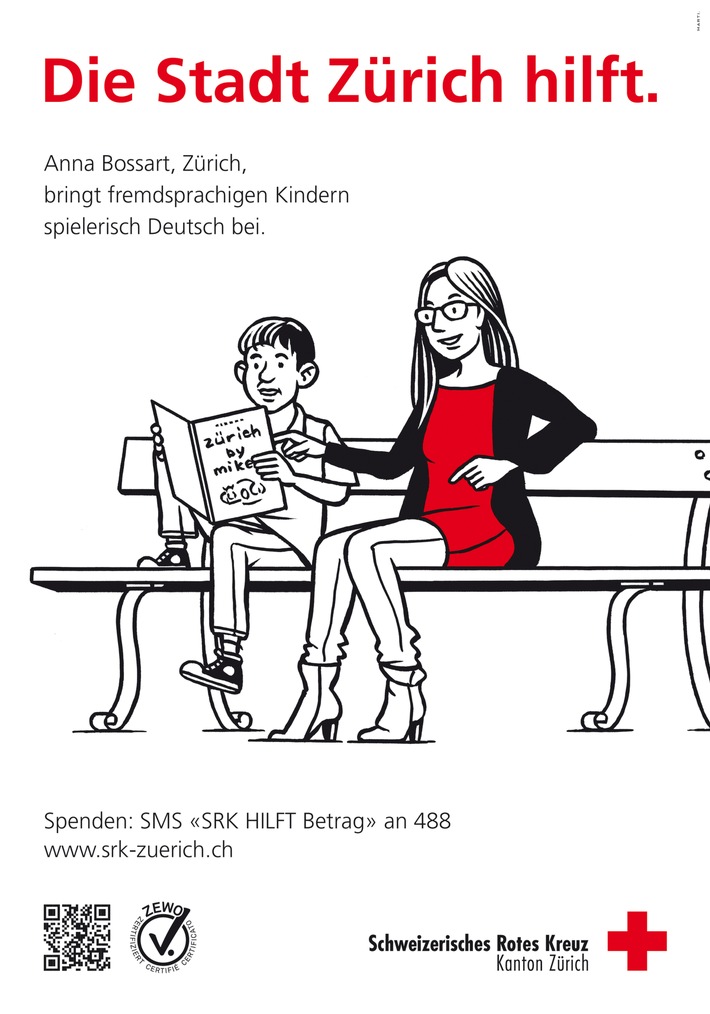 MedienmitteilungRegionale Werbekampagne des SRK Kanton Zürich: Begeisterte Rotkreuzler werben auf Plakaten (BILD & VIDEO)2013-07-03T11:00:00Zürich (ots) - Die Plakatkampagne des Schweizerischen Roten Kreuzes (SRK) Kanton Zürich rückt die Menschen und ihre Tätigkeiten, die sie im Namen der Organisation ausüben, in den Vordergrund. 17 Freiwillige und Mitarbeitende aus allen Zürcher Regionen haben sich in einer typischen Situation zeichnen lassen. Mit der letztjährigen Kampagne stellte das SRK Kanton Zürich bereits mit Porträtzeichnungen Freiwillige und Mitarbeitende in den Mittelpunkt. Dieses Jahr stehen die vielseitigen Tätigkeiten in allen Zürcher Regionen im Fokus. Unter dem Motto «Die Region hilft» hat der Illustrator Christophe Badoux 17 Personen bei ihrer Arbeit in einer typischen Situation vor Ort gezeichnet. Hinter allen Sujets stehen überzeugte Freiwillige und Mitarbeitende, die sich im Auftrag des SRK Kanton Zürich regional für Benachteiligte einsetzen und mit Überzeugung anderen Menschen helfen. Anna Bossart zum Beispiel engagiert sich in einem Integrationsprogramm des SRK Kanton Zürich in der Stadt Zürich für Kinder. Oder Ruth und Anton Stöcklin: Sie unterstützen mit ihrem Einsatz für den Rotkreuz-Fahrdienst im Zürcher Unterland mobil eingeschränkte Menschen. Die Plakate hängen seit dieser Woche im Kanton Zürich und zeigen auf, dass das kantonale Hilfswerk für Menschen in der Region da ist. Das SRK Kanton Zürich hat zudem vier Reportagevideos aus dem Zürcher Rotkreuzalltag gedreht, darunter über Anna Bossart sowie Ruth und Anton Stöcklin. Videos und mehr unter: www.srk-zuerich.ch . Das Schweizerische Rote Kreuz Kanton Zürich Das Schweizerische Rote Kreuz (SRK) Kanton Zürich erfüllt wichtige humanitäre Aufgaben auf kantonaler Ebene. In Form von direkter Hilfe, Beratung und Bildung trägt das SRK Kanton Zürich dazu bei, dass das Leben für viele Menschen im Kanton lebenswerter wird. Hilfe zur Selbsthilfe wird dabei gross geschrieben. In den Bereichen Gesundheit, Soziales und Migration/Asyl setzen sich rund 90 Mitarbeitende und über 2'400 Freiwillige im ganzen Kanton dafür ein, dass Benachteiligte im Alltag besser integriert werden und bleiben. Die breite Palette von Hilfeleistungen des SRK Kanton Zürich steht im Zeichen der Menschlichkeit und wird nach den Grundsätzen der Rotkreuz-Bewegung den aktuellen Bedürfnissen angepasst und laufend weiterentwickelt. Das SRK Kanton Zürich finanziert sich durch Spenden und Mitgliederbeiträge (39 Prozent) sowie durch Leistungsaufträge (18 Prozent) und Erträge aus Dienstleistungen und Projekten (40 Prozent). Der unentgeltliche Einsatz von Freiwilligen von über 159'000 Stunden im Jahr 2012 entspricht in Form von Zeitspenden rund 4,8 Millionen Franken. Kontakt: Anita Ruchti, SRK Kanton Zürich Permalink: