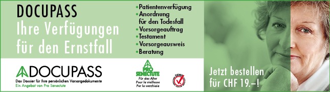 MedienmitteilungPatientenverfügungen & Co. - DOCUPASS setzt mit 50'000 verkauften Exemplaren Massstäbe (ANHANG)2013-08-05T12:00:00Zürich (ots) - Wer eine Patientenverfügung verfassten möchte, sieht sich mit einer Angebotsvielfalt konfrontiert, die für Laien kaum durchschaubar ist. Umso erfreulicher, dass sich Fachwelt und Privatpersonen sechs Monate nach Inkrafttreten des neuen Erwachsenenschutzrechtes einig sind: Das DOCUPASS-Vorsorgedossier von Pro Senectute ist das überzeugendste Angebot auf dem Schweizer Markt. 50'000 verkaufte DOCUPASS-Vorsorgedossiers Die markanten Verkaufszahlen ein Jahr nach der Einführung bescheinigen dem DOCUPASS durchwegs Bestnoten. Das von Fachexperten unter Einbezug der Kompetenzen von Pro Senectute entwickelte Gesamtpaket beinhaltet nicht nur eine Patientenverfügung, sondern darüber hinaus alle Informationen und Formulare für Vorsorgeauftrag, Anordnungen im Todesfall und Testament. Ebenfalls im Angebot enthalten ist ein Vorsorgeausweis mit den Kontaktdaten für den Ernstfall. Dennoch kostet der DOCUPASS lediglich CHF 19.- und kann online unter: www.pro-senectute.ch/docupassd oder via Tel. 044 283 89 89 bestellt werden. Ärzte und Spitäler neu zur Nachfrage verpflichtet In Zukunft wird der Bedarf für persönliche Vorsorgedokumente weiter steigen. Seit Kurzem sind Medizinalpersonen vor jedem Eingriff verpflichtet, nach einer Patientenverfügung zu fragen. Da eine solche sich auch mit der besten Hilfestellung nicht leichtfertig verfassen lässt, ist man gut beraten, sich frühzeitig darum zu kümmern. Wer sich für den DOCUPASS entscheidet, ist im Hinblick auf die Zukunft gut beraten: Pro Senectute befindet sich in der Testphase für eine Online-Hinterlegung des Dossiers, welche per Ende Jahr angeboten wird. Pro Senectute Pro Senectute ist die grösste Fach- und Dienstleistungsorganisation der Schweiz im Dienste der älteren Menschen. Die 1917 gegründete Stiftung setzt sich für das Wohl, die Würde und die Rechte älterer Menschen ein. Pro Senectute ist national mit einer Geschäfts- und Fachstelle und mit 22 kantonalen und 2 interkantonalen Pro Senectute-Organisationen präsent. Mehr als 130 Beratungsstellen bieten eine Vielzahl von Serviceleistungen an, zum Beispiel Sozialberatung, Dienstleistungen für ein selbstbestimmtes Leben zuhause sowie ein umfangreiches Angebot an Bildungskursen und Bewegungsangeboten. Mit Generationenprojekten und Gemeinwesenarbeit engagiert sich Pro Senectute für den Austausch zwischen den Generationen und die Integration der älteren Menschen in die Gesellschaft. Pro Senectute Schweiz ist seit 1942 mit dem ZEWO-Gütesiegel zertifiziert. Das Label zeichnet gemeinnützige Organisationen für ihren gewissenhaften Umgang mit Spendengeldern aus. Pro Senectute Schweiz richtet ihre Organisation und Geschäftsführung zudem nach den Richtlinien des Swiss NPO-Codes aus. Kontakt: Pro Senectute Schweiz Permalink: