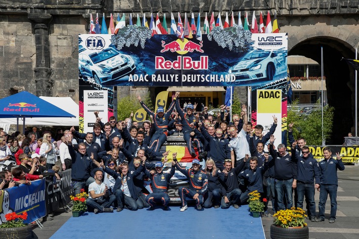 Der Jubel im Hyundai Shell World Rally Team kennt keine Grenzen: Zum ersten Mal in der Geschichte der erst 18 Monate jungen Mannschaft aus dem fränkischen Alzenau endete ein WM-Lauf mit einem Hyundai-Sieg. Bei der gelungenen Asphaltpremiere des Hyundai i20 WRC rund um Trier ging Thierry Neuville mit Beifahrer Nicolas Gilsoul am Schlusstag in Führung und eroberte mit 40,7 Sekunden Vorsprung vor seinen zweitplatzierten Teamkollegen Dani Sordo/Marc Martí seinen ersten WM-Sieg. Für Hyundai ist der doppelte Premierensieg nach zwei dritten Plätzen in Mexiko und Polen der dritte Podiumserfolg der Saison