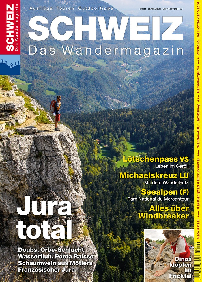 MedienmitteilungWandermagazin SCHWEIZ: Jura total (BILD)2014-09-02T10:30:00Solothurn (ots) - Der Jura ist mit seinen sanften Hügeln, den weiten Gipfelplateaus und den tiefen Schluchten ein ganzjähriges Wandergebiet. Das Wandermagazin SCHWEIZ war vom Rheinfall bis an die französische Grenze unterwegs und zeigt in der neuen Ausgabe die schönsten Jura-Touren. Aus dem Inhalt - Zu Gast bei: Christine Mauler, Schaumweinherstellerin in Môtiers - Familientipp: Dinosaurier klopfen im Fricktal - Biaufond JU: Auf dem Klettersteig «Les Echelles de la Mort» - Reclère JU: Grenzschlängeln auf dem Circuit des Fermes - Naturtipp: Leben im Geröll am Lötschenpass VS - Für Senioren: Unterwegs mit dem WanderFritz - Portfolio: Lichter der Nacht, von Marco Faggi - Hintergrund: Windbreaker - Schritte über die Grenze: Parc National du Mercantour (F) - Lesertour: Karstlehrpfad Kaltbrunnental BL - Wandernews, Buchtipps, Ausstellungen und Events Die Ausgabe «Jura total» des Wandermagazins SCHWEIZ ist ab sofort an allen grossen Kiosken oder direkt beim Rothus Verlag erhältlich (Preis CHF 14.80). www.wandermagazin.ch, wandermagazin@rothus.ch, Tel. 032 626 40 29. Download Titelseite und Medienmitteilung des aktuellen «Wandermagazin SCHWEIZ»: www.wandermagazin.ch Rezensionsexemplare gratis erhältlich. Kontakt: Wandermagazin SCHWEIZ, Schöngrünstrasse 2, 4500 Solothurn Permalink: