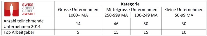 MedienmitteilungSwiss Arbeitgeber Award 2014: Die vier Sieger sind die SV Group, die Liechtensteinische Alters- und Krankenhilfe (LAK), das Hotel Hof Weissbad und die ipt Innovation Process Technology AG (BILD)2014-09-17T21:00:00Bern (ots) - Am 17. September wurde in Bern der 14. Swiss Arbeitgeber Award feierlich verliehen. Die SV Group, die Liechtensteinische Alters- und Krankenhilfe (LAK), das Hotel Hof Weissbad und die ipt Innovation Process Technology AG wurden von ihren Mitarbeitenden zu den besten Arbeitgebern der Schweiz und Liechtensteins gekürt. Am diesjährigen Swiss Arbeitgeber Award bestand die Jury aus 35'301 Mitarbeitenden aus 140 Unternehmen - ein Rekord seit dem 14-jährigen Bestehen. Mitarbeitende, die an der umfassenden Mitarbeiterbefragung teilnahmen, beantworteten 55 Fragen zu zentralen Aspekten ihrer Arbeitssituation, ihrer Arbeitszufriedenheit und ihrem Commitment gegenüber dem Arbeitgeber. Aus den Antworten wurden schliesslich die besten Arbeitgeber ermittelt. Damit ist der Swiss Arbeitgeber Award der einzige Award in der Schweiz, bei dem alleine das Urteil der Mitarbeitenden - der internen Experten - zählt. Die feierliche Verleihung des 14. Swiss Arbeitgeber Awards fand im Rahmen des HR Swiss Congress im Bern statt. Dabei wurden zusammenfassend auch die wichtigsten Erkenntnisse aus den Mitarbeiterbefragungen präsentiert. Vor rund 250 Gästen wurden die Trophäen übergeben und die Gewinner in kurzen Filmporträts vorgestellt. Das anschliessende Dinner bot den anwesenden Vertretern der Unternehmen eine hervorragende Gelegenheit, sich auszutauschen und ihre guten Resultate zu feiern. Dieses Jahr wurde der Swiss Arbeitgeber Award erstmals in vier Grössenkategorien (vgl. Tabelle) vergeben. So konnte Bewertungsunterschieden, die sich aufgrund der Unternehmensgrösse ergeben, Rechnung getragen werden. In der Kategorie der grossen Unternehmen (1000 und mehr Mitarbeitende) wurden die besten fünf der insgesamt 14 teilnehmenden Unternehmen als Top Arbeitgeber prämiert. Als Gewinnerin ging die SV Group hervor. In den beiden Kategorien der mittelgrossen Unternehmen wurden jeweils die Top 15 ausgezeichnet. An die Spitze der insgesamt 46 Unternehmen der Kategorie mit 250 bis 999 Mitarbeitenden schaffte es die Liechtensteinische Alters- und Krankenhilfe (LAK). Unter den 50 Unternehmen der Kategorie mit 100 bis 249 Mitarbeitenden verteidigte das Hotel Hof Weissbad erfolgreich seine letztjährige Spitzenposition. Von den 30 Unternehmen mit 50 bis 99 Mitarbeitenden wurden die besten 10 ausgezeichnet. Die ipt Innovation Process Technology AG konnte sich hier als Siegerin durchsetzen. Im Rahmen des Awards erhalten alle teilnehmenden Unternehmen auch eine fundierte Auswertung ihrer Mitarbeiterbefragung. Dieses umsetzungsorientierte Reporting wird in der Regel bis auf Abteilungs- oder Teamebene aufgeschlüsselt. Vergleiche zu früheren Befragungen sowie zu externen Benchmarks verdeutlichen Entwicklungspotenziale und zeigen die Stärken des Unternehmens als Arbeitgeber auf. Dies macht die Teilnahme am Award zu einem wertvollen Instrument für die Organisationsentwicklung. Durchgeführt wird der Swiss Arbeitgeber Award von icommit, einem führenden Beratungsunternehmen für Mitarbeiterbefragungen. Partner, die den Swiss Arbeitgeber Award unterstützen, sind HR Swiss, der Schweizerische Arbeitgeberverband, das Wirtschaftsmagazin BILANZ und die GfK Switzerland AG. Mehr Infos, die Ranglisten und die Filmporträts der Gewinner unter www.swissarbeitgeberaward.ch. Für Rückfragen und weitere Informationen: Sven Bühler, Geschäftsleiter icommit und Studienleiter Permalink: