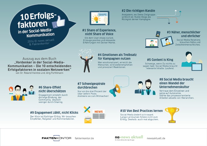 Die Erfolgsfaktoren sind ein Auszug aus dem Buch "Vordenker in der Social-Media-Kommunikation - Die 10 entscheidenden Erfolgsfaktoren in sozialen Netzwerken" von Dr. Roland Heintze (Faktenkontor) und Jörg Forthmann (Faktenkontor).