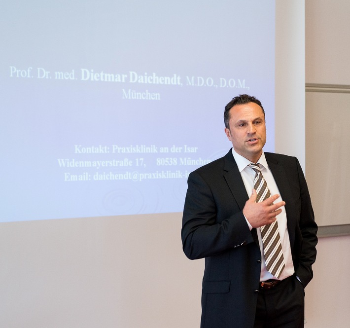 MedienmitteilungErstmalig in Deutschland wird eine Professur für "Osteopathische Medizin" eingerichtet2015-04-20T09:01:08Berlin (ots) - Die Steinbeis Hochschule Berlin ernannte am 14.04.2015 Dietmar Daichendt zum ersten Professor für "Osteopathische - und Manuelle Medizin" in Deutschland. Die Professur ist als anwendungsbezogene Forschungsprofessur an der Steinbeis-Hochschule für vorerst 3 Jahre eingerichtet. Daichendt, der bereits 2011 auf die deutschlandweit erste Professur in "Osteopathie" und "Chirotherapie" an die "Hochschule für Gesundheit und Sport" berufen worden war, freut sich sehr über seine Ernennung durch die Steinbeis Hochschule. Am Rande der Veranstaltung anlässlich seiner Antrittsvorlesung, im "Steinbeis Haus für Management und Technologie" in Stuttgart, sagte Daichendt: "Die Einrichtung einer Forschungsprofessur für "Osteopathische- und Manuelle Medizin" ist der nun nächste notwendige Schritt in Deutschland. Ich danke Herrn Professor Löhn und dem Berliner Wissenschaftssenat für die Umsetzung dieser Vision und freue mich auf die nächsten Jahre im Wissenschaftsverbund der Steinbeis-University." Zur Person: Univ.-Prof. Dr. med. Dietmar Daichendt, Professor für "Osteopathische- und Manuelle Medizin" ist in München, Berlin und Salzburg niedergelassener Allgemeinarzt mit Schwerpunkten der komplementären Schmerzmedizin, insbesondere der Osteopathie und Chirotherapie. Er ist Präsident der "Deutsche Gesellschaft für Chirotherapie und Osteopathie e.V." und Mitglied des Lehrkörpers der Steinbeis-Hochschule Berlin sowie der Ludwig-Maximilians-Universität München. Er ist Inhaber der "Praxisklinik an der Isar" in München, verheiratet und hat 2 Kinder. Zur Steinbeis-Hochschule Berlin: Die 1998 gegründete private, staatlich anerkannte Steinbeis Hochschule Berlin (SHB) bietet Studierenden und Unternehmen berufsintegrierte und praxisorientierte Studienprogramme mit staatlich anerkannten Abschlüssen und forscht an anwendungsbezogenen Problemstellungen. Sie hat Promotionsrecht und somit Universitätsstatus. Präsident ist Prof. Dr. Dr. h. c. mult. Johann Löhn Zur "Deutschen Gesellschaft für Chirotherapie und Osteopathie e.V.": Die DGCO e. V. ist eine wissenschaftliche Ärztefachgesellschaft mit Sitz in München. Sie wurde 1998 in Stuttgart gegründet. Sie hat die wissenschaftliche und öffentliche Verbreitung der Osteopathie / Osteopathischen Medizin und der Chirotherapie / Manuellen Medizin zum Ziel. Sie ist Deutschlands mitgliederstärkste ärztliche Fachgesellschaft in diesen Fachgebieten. Ihr Präsident ist seit 2005 Univ.-Prof. Dr. med. Dietmar Daichendt. Kontakt: Deutsche Gesellschaft für Chirotherapie und Osteopathie e. V. Permalink:
