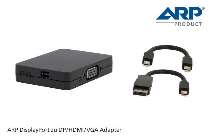 MedienmitteilungDas Multitalent unter den Video-Adaptern: Der neue ARP DisplayPort Adapter2015-04-29T18:35:20Rotkreuz (ots) - Mit dem «DisplayPort zu DP/HDMI/VGA Adapter» von ARP hat man immer den richtigen Video-Adapter zu Hand. Man kann zusätzlich bis zu drei Videoausgabegeräte gleichzeitig an sein Tablet oder Notebook anschliessen. Mobilität dank Notebooks und Tablets hat viele Vorteile. Man ist zum Arbeiten nicht an einen bestimmten Ort gebunden und hat auch sein vertrautes Gerät mit allen Daten immer dabei. Wird ein grösseres Ausgabegerät für eine Präsentation oder ein Meeting benötigt, schliesst man einfach einen Beamer oder Monitor an. Doch ganz so einfach ist es häufig leider nicht. Falls der Anschluss am eigenen Gerät nicht zur Schnittstelle beim gewünschten Ausgabegerät passt, geht gar nichts. Es sei denn, man hat den entsprechenden Adapter zur Hand, wie etwa den neuen «DisplayPort zu DP/HDMI/VGA Adapter» von ARP. Mit ihm kann man sein Notebook oder Tablet an jedes Ausgabegerät anschliessen, welches entweder einen VGA-, HDMI- oder DisplayPort-Anschluss hat. Einzige Voraussetzung ist ein DisplayPort- oder Mini DisplayPort-Ausgang am eigenen Gerät. (Mini) DisplayPort-Anschlüsse sind weit verbreitet bei aktuellen Notebooks und Tablets. Man findet sie beispielsweise an allen Macbook Air- und Macbook Pro-Modellen von Apple, bei vielen HP- und Dell-Notebooks und verschiedenen Tablets, wie zum Beispiel dem Microsoft Surface Pro 3. Aber der ARP Adapter kann noch mehr. Dank integrierter «Multi Stream Transport» Technologie können bis zu drei Monitore gleichzeitig an den Adapter angeschlossen werden. Das macht ihn nicht nur zum idealen Adapter für unterwegs, sondern auch zum praktischen Monitor-Signalverteiler für den Arbeitsplatz oder das Home-Office. Der neue «DisplayPort zu DP/HDMI/VGA Adapter» von ARP ist ab sofort zum Preis von CHF 159.- im ARP Online-Shop erhältlich (Art.-Nr.: 5047905). Dort findet man auch alle technischen Spezifikationen, die tagesaktuelle Verfügbarkeit sowie eine grosse Auswahl weiterer Adapter und Extender. Kontakt: ARP Gruppe: Permalink: