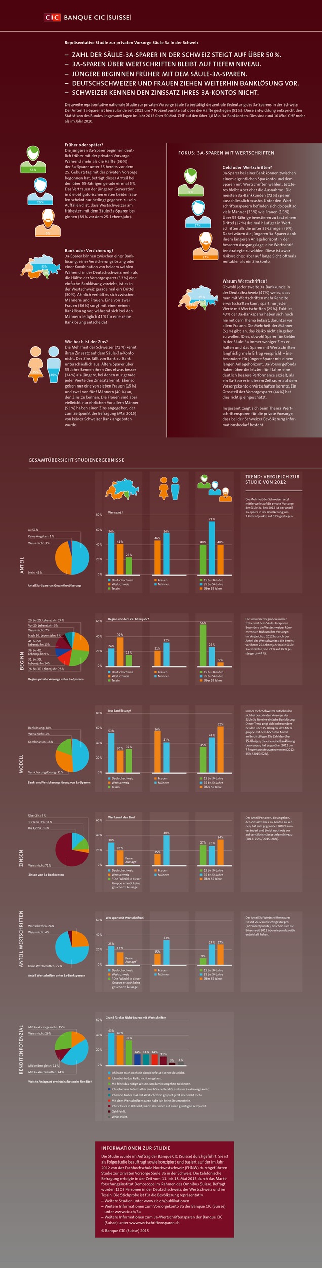 51 Prozent und damit mehr als die Hälfte aller Schweizerinnen und Schweizer sparen im Jahr 2015 über die private Vorsorge der Säule 3a. Dies sind 16 Prozent mehr als noch vor drei Jahren. Für ihr 3a-Geld wählen Deutschschweizer und Frauen bevorzugt die Banklösung. Den Zinssatz auf dem Säule-3a-Konto kennt die Mehrheit der Schweizer nicht. Während jüngere Sparer deutlich früher mit der privaten Vorsorge beginnen als ihre Eltern und Grosseltern, sind sie bei der Vorsorge 3a mit Wertschriften zurückhaltender. Sparen mit Wertschriften bleibt in der Schweiz grundsätzlich wenig genutzt. Diese und weitere Erkenntnisse liefert die zweite Studie zur privaten Vorsorge Säule 3a in der Schweiz, die das Forschungsinstitut Demoscope im Auftrag der Banque CIC (Suisse) durchgeführt hat.