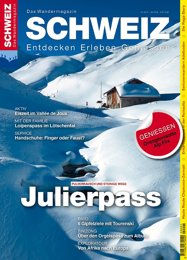 MedienmitteilungWandermagazin SCHWEIZ: Julierpass2016-01-05T08:30:02Solothurn (ots) - Bivio, das schmucke Dorf im bündnerischen Surses, ist eine historische Wegscheide: Auf der einen Seite führen die asphaltierten Kehren der Julier-Passstrasse ins Engadin, auf der anderen Seite der alte Säumerweg über den Septimerpass ins Bergell. Viele kommen aber nach Bivio, um Ruhe zu finden - auf Skitouren in einer fast unendlich sich dehnenden weissen Arena oder auf Wanderungen in der spektakulären Bergwelt des Parc Ela. Aus dem Inhalt - Julier-Hospiz: Exploratour - von Afrika nach Europa - Familientipp: Langlaufen - nicht langweilig! - Portfolio: Haute Route Chamonix - Zermatt - Weltneuheit: Crossblades - Die Retter der Lüfte - Naturtipp: Erika-Teppiche in der Ruinaulta - Seniorentour: Von der Tschentenalp nach Adelboden BE - Eiszeit im Vallée de Joux Die Ausgabe «Julierpass» des Wandermagazin SCHWEIZ ist ab sofort an allen grossen Kiosken oder direkt beim Rothus Verlag erhältlich (Preis CHF 14.80). www.wandermagazin.ch, wandermagazin@rothus.ch, Tel. 032 626 40 29. Kontakt: Download Titelseite und Medienmitteilung des aktuellen Permalink: