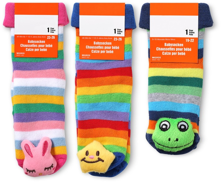 MedienmitteilungMigros ruft Babysocken mit aufgenähter Rassel zurück2016-02-16T17:00:00Zürich (ots) - Die Migros ruft die bunt geringelten Babysocken mit einem aufgenähten Plüschköpfchen aus Sicherheitsgründen zurück. Da sich das Plüschelement leicht von der Socke lösen kann, besteht die Gefahr, dass die kleine integrierte Rassel verschluckt werden kann. Die bunten Babysocken in verschiedenen Grössen (Artikel-Nr. 8922.163) gibt es in den Farben Türkis, Pink und Grün mit den Plüschsujets Häschen, Frosch und einem Stern. Die aufgenähten Plüschelemente können leicht abgerissen werden, wodurch auch die kleine integrierte Rassel problemlos entfernbar wird. Diese Rassel ist ein verschluckbares Kleinteil; für das Baby besteht eine Erstickungsgefahr. Die Migros bittet ihre Kunden, das Plüschelement auf den Socken aus Sicherheitsgründen zu entfernen. Selbstverständlich können die Babysocken, die erst seit Ende Januar 2016 im Verkauf sind, auch gegen Rückerstattung des Verkaufspreises von CHF 6.90 in die Migros-Filialen zurückgebracht werden. Ein druckfähiges Produktfoto kann unter folgendem Link heruntergeladen werden: http://media.migros.ch/images/2016/babysocken.jpg Kontakt: Monika Weibel, Mediensprecherin MGB, Tel. 044 277 20 63, Permalink: