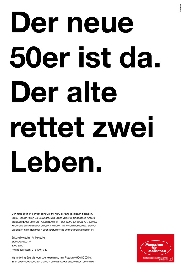 Medienmitteilung«Der neue 50er ist perfekt zum Geldhorten, der alte ideal zum Spenden.»2016-04-12T08:30:00Zürich (ots) - Die Stiftung Menschen für Menschen Schweiz lanciert heute Dienstag, den 12. April, eine aussergewöhnliche Kampagne mit der sie die Schweizer Bevölkerung für die schlimmste Dürre seit 30 Jahren in Äthiopien sensibilisieren will. Dabei ist sie überzeugt: Jetzt muss dringend gehandelt werden. Der Gedanke hinter der Aktion: Auch wenn die Schweizerische Nationalbank neue 50er-Noten einführt, sind die alten Noten alles andere als Altpapier. Sie können sogar Leben retten. Darauf weist die Stiftung Menschen für Menschen Schweiz hin und lädt die Schweizer Bevölkerung ein, mit ihren alten Scheinen Kinder vor dem Hungertod zu bewahren. "Die neue 50er-Note ist perfekt zum Geldhorten, die alte ideal zum Spenden", erfahren die Leser in der heutigen Ausgabe der NZZ und im Blick: "Mit 50 Franken retten Sie Gesundheit und Leben von zwei äthiopischen Kindern." Aktuell leidet das Land am Horn von Afrika unter der grössten Dürre seit 30 Jahren. 400'000 Kinder sind schwer unterernährt. Menschen für Menschen Schweiz leistet Nothilfe im besonders schwer betroffenen Landkreis Mille in der Region Afar, wo die Hirtenfamilien fast ihren gesamten Viehbestand verloren haben. Die Kinder sind dringend auf eiweissreiche Zusatznahrung angewiesen, damit sie keine Gesundheits- und Entwicklungsschäden erleiden oder gar an Entkräftung sterben. "Stecken Sie einfach Ihre alten 50er Note in einen Briefumschlag und schicken Sie diesen an die Stiftung Menschen für Menschen Schweiz", so die Handlungsaufforderung. Natürlich könne man das Geld auch klassisch überweisen, etwa über die Homepage der Stiftung www.menschenfuermenschen.ch. Dort erfahren Interessierte auch alle Hintergründe zur Dürrekatastrophe und der dringlichen Nothilfe. Spendenkonto: Postkonto 90-700 000-4 IBAN: CH97 0900 0000 9070 0000 4 BIC: POFICHBEXXX Online spenden: www.menschenfuermenschen.ch Bildmaterial https://www.menschenfuermenschen.ch/category/bilder Kontakt: Medienkontakt: Permalink: