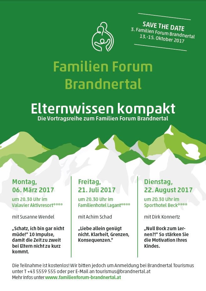 MedienmitteilungMehr Zweisamkeit für Eltern - BILD2017-02-21T13:08:22Eltern werden ist nicht schwer - Paar bleiben aber sehr. Elternwissen kompakt- die Vortragsreihe zum Familien Forum Brandnertal beschäftigt sich Anfang März mit diesem Thema. Bludenz (ots) - Die meisten Eltern verlieren sich als Paar irgendwo zwischen Windeln wechseln, Familienaktivitäten und Arbeit aus den Augen. Sie planen alles. Außer Zeit für sich zu zweit. Eine glückliche Liebesbeziehung zwischen Eltern ist eine starke Basis für ein gesundes Familienleben. Aber wie können wir das erreichen? Am Montag, 6. März 2017 widmet sich Susanne Wendel bei "Elternwissen kompakt" um 20.30 Uhr im Valavier Aktivresort**** in Brand dieser Frage. Und schon vorab geben wir Ihnen einen Hinweis. Ein Geheimnis starker Paare: Sie sind auch als Eltern ein Liebespaar und nicht nur ein "Erziehungsteam". Susanne Wendels Vortrag gibt 10 Impulse, wie Sie wieder Paar werden und damit sich selbst und auch den Kindern viel Power geben können. Zwtl.: Erfahren Sie unter anderem: ? Wie man es schafft, auch in stressigen Zeiten mehr Anerkennungen als Vorwürfe auszusprechen ? Wie man eingefahren Gewohnheiten auf die Schliche kommt und sie verändert ? Wie man die Erotik einlädt wenn sie sich rar macht und den Spaß im Bett wieder neu entdeckt. ? Warum es unterschiedliche Liebessprachen gibt und wie man die Sprache des anderen lernt ? Warum Humor das Wichtigste für eine gute Beziehung ist und wie man wieder mehr zusammen lacht Zwtl.: Elternwissen kompakt - die Vortragsreihe Susanne Wendels Vortrag ist Auftakt für drei Abende, die im Zeichen vom Familienleben mit all seinen Hindernissen und Bereicherungen stehen: Bei "Elternwissen kompakt - die Vortragsreihe zum Familien Forum Brandnertal" geben anerkannte Experten Einblicke, die das Familienleben erleichtern. Die Vorträge sind kostenlos, um Anmeldung wird gebeten: Tourismusbüro Brand, +43 5559 555 oder tourismus@brandnertal.at Zwtl.: Die Termine im Überblick: "Schatz, ich bin gar nicht müde!" 10 Impulse, damit die Zeit zu zweit bei Eltern nicht zu kurz kommt. Susanne Wendel am Montag, 6. März 2017, 20.30 Uhr Valavier Aktivresort****, Brand "Liebe allein genügt nicht. Klarheit, Grenzen, Konsequenzen." Achim Schad am Freitag, 21. Juli 2017, 20.30 Uhr Familienhotel Lagant****, Brand "Null Bock zum Lernen?!" So stärken Sie die Motivation Ihres Kindes. Dirk Konnertz am Dienstag, 22. August 2017 im Sporthotel Beck****, Brand Das dritte Familien Forum Brandnertal findet vom 13.-15.Oktober 2017 in Brand statt. Elternwissen kompakt mit Susanne Wendel