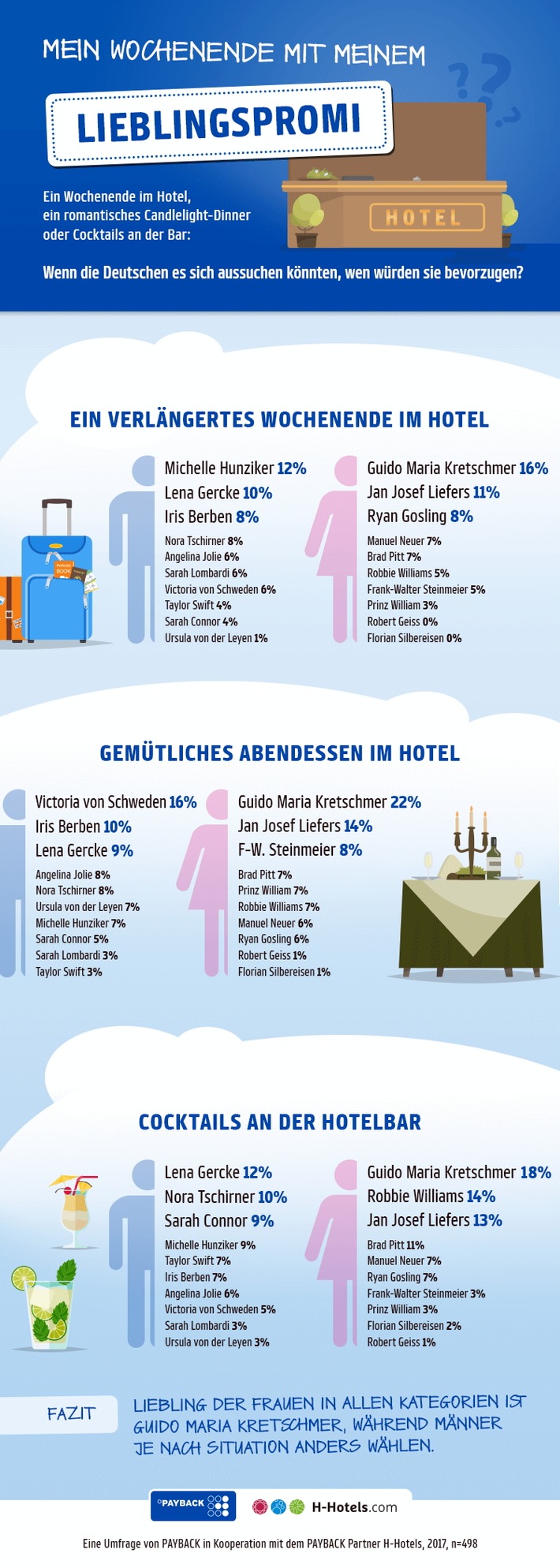 Wenn die Deutschen es sich aussuchen könnten: Mit welchem Promi würden sie am liebsten ein verlängertes Wochenende im Hotel verbringen, sich zu einem romantischen Dinner im Restaurant verabreden oder Cocktails an der Hotelbar trinken? Diese Fragen haben die H-Hotels und das Bonusprogramm PAYBACK im Rahmen einer Onlinebefragung rund 500 PAYBACK Kunden gestellt. Die Ergebnisse der Umfrage zeigen: Liebling der Frauen in allen Kategorien ist Guido Maria Kretschmer.