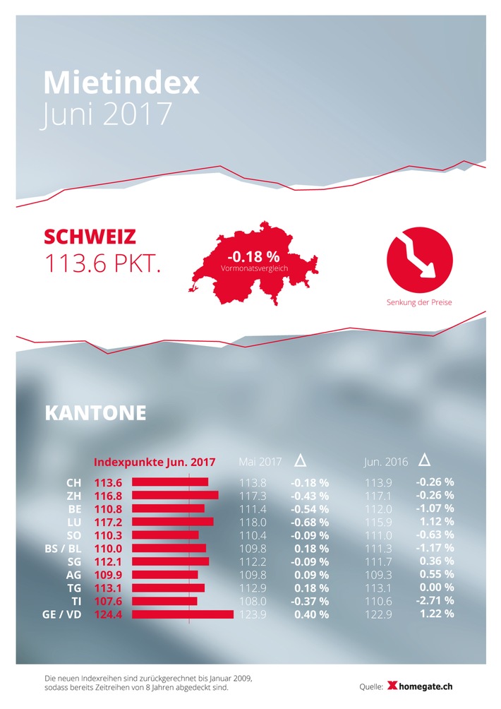 Medienmitteilunghomegate.ch-Mietindex: Senkung der Angebotsmieten im Juni 20172017-07-04T10:00:24Zürich (ots) - Im Juni 2017 sinken die Angebotsmieten in der Schweiz um 0.18 Indexpunkte und steht somit bei 113.6 Punkten. Im Vergleich zum Vorjahresmonat sinken die Mieten um 0.26 Prozent. Auch im Kanton Zürich sind die Angebotsmieten rückläufig um 0.43 Prozent. Zu diesem Ergebnis kommt der homegate.ch-Angebotsmietindex, der vom Immobilienportal homegate.ch in Zusammenarbeit mit der Zürcher Kantonalbank (ZKB) erhoben wird. Er misst die monatliche, qualitätsbereinigte Veränderung der Mietpreise für neue und wieder zu vermietende Wohnungen anhand der aktuellen Marktangebote. Veränderung in den Kantonen Die Kantone Zürich (-0.43 Prozent), Bern (-0.54 Prozent), Luzern (-0.68 Prozent), Solothurn (-0.09 Prozent), St. Gallen (-0.09 Prozent) und Tessin (-0.37 Prozent) verzeichnen einen Rückgang der Mieten. In den Kantonen Basel (0.18 Prozent), Aargau (0.09 Prozent), Thurgau (0.18 Prozent) und Genf und Waadt (0.40 Prozent) steigen die Angebotsmieten im Juni 2017 leicht. Qualitätsbereinigung Die Entwicklung der Angebotsmietpreise für die Schweiz wird um die unterschiedliche Qualität, Lage und Grösse der Wohnungen korrigiert. Der Vorteil dieser so genannten hedonischen Methode liegt darin, dass die wirkliche Mietpreisentwicklung für neue und wieder zu vermietende Wohnungen auf homegate.ch abgebildet wird. Der homegate.ch-Angebotsmietindex ist der älteste qualitätsbereinigte Mietpreisindex der Schweiz. Weitere Informationen sowie unsere aktuelle Grafik erhalten Sie unter: https://presse.homegate.ch/de/mietzinsindex/ Der nächste homegate.ch-Mietindex erscheint am 03. August 2017. Kontakt: Homegate AG Permalink: