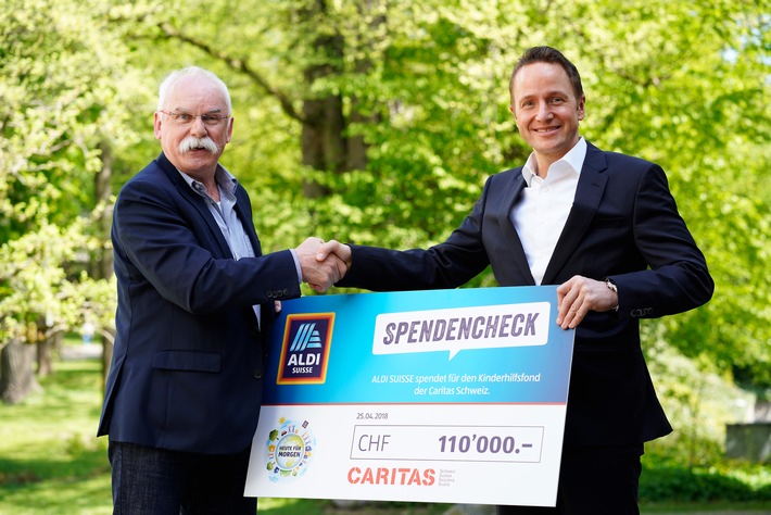 Bereits seit sechs Jahren unterstützt der Schweizer Discounter das Hilfswerk Caritas Schweiz bei der Bekämpfung von Kinder- und Familienarmut. Am gestrigen Mittwoch, den 25.04.2018, nahm Caritas-Direktor Hugo Fasel am Hauptsitz in Luzern einen Spendencheck in Höhe von 110'000 Schweizer Franken von Timo Schuster, Landesgeschäftsführer der ALDI SUISSE AG, entgegen. Die Spendensumme kommt dem Kinderhilfsfonds der Caritas zugute.