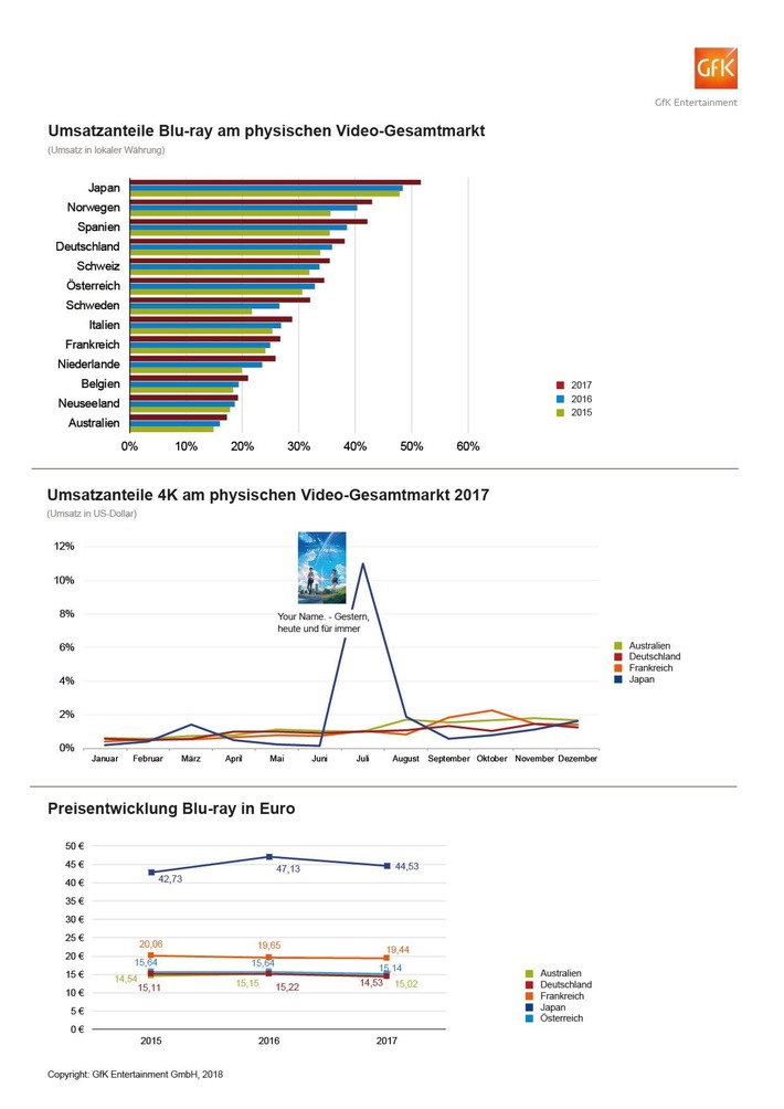 MedienmitteilungVideomarkt: Blu-ray vergrößert Anteile weltweit2018-05-30T11:39:49Baden-Baden (ots) - Blu-ray-Discs haben ihren Anteil am physischen Video-Gesamtmarkt in den vergangenen drei Jahren weltweit ausgebaut. Daneben stößt das 2016 gestartete, hochauflösende 4K Ultra HD-Format auf steigendes Interesse. Die Preise sind seit 2015 indes annähernd konstant geblieben. Dies sind die Kernergebnisse einer 13 Länder übergreifenden Auswertung von GfK Entertainment für die DEG (Digital Entertainment Group). In Deutschland wurden 2017 rund 38 Prozent der physischen Video-Erlöse mit Blu-rays erzielt. 2015 waren es noch 34 Prozent. Auch in Österreich und der Schweiz verbesserten sich die Blu-ray-Marktanteile um jeweils drei Prozentpunkte auf 34 bzw. 35 Prozent. Die größte Begeisterung kommt in Japan auf, wo mittlerweile mehr als jeder zweite Yen (52 Prozent) mit Blu-rays erwirtschaftet wird. Der Anteil von 4K am physischen Gesamtmarkt lag Ende 2017 bei jeweils rund zwei Prozent - Tendenz steigend. Kleinere Wachstums-Schübe gab es zwischendurch immer wieder. Besonderes Augenmerk galt beispielsweise dem Anime "Your Name. - Gestern, heute und für immer", der in Japan auch als 4K-Ausgabe ein riesiger Erfolg war. Das Preisniveau der Blu-ray bleibt insgesamt recht stabil. 2017 kosteten Blu-rays hierzulande durchschnittlich 14,53 Euro und waren damit fast 60 Cent günstiger als 2015. Ähnlich sieht es in Österreich aus: Dort fiel der Preis leicht um 50 Cent auf nun 15,14 Euro. Franzosen zahlen für ihre Blu-rays im Schnitt 19,44 Euro, Japaner sogar fast 45 Euro. Basis der Auswertung sind die Daten aus folgenden Ländern: Australien, Belgien, Deutschland, Frankreich, Italien, Japan, Neuseeland, Niederlande, Norwegen, Österreich, Schweden, Schweiz und Spanien. GfK Entertainment ist offizieller Partner der DEG (Digital Entertainment Group) und ermittelt seit über 15 Jahren die DVD- und Blu-ray-Verkaufszahlen für Deutschland und viele weitere Länder. Seit 2016 bereitet GfK Entertainment umfassende digitale Film- und Seriendaten der Wachstumsmärkte Video-on-Demand und Electronic-Sell-Through auf. GfK Entertainment ist Teil der GfK, eines der weltweit größten Marktforschungsunternehmen. Kontakt: Hans Schmucker, hans.schmucker@gfk.com Permalink: