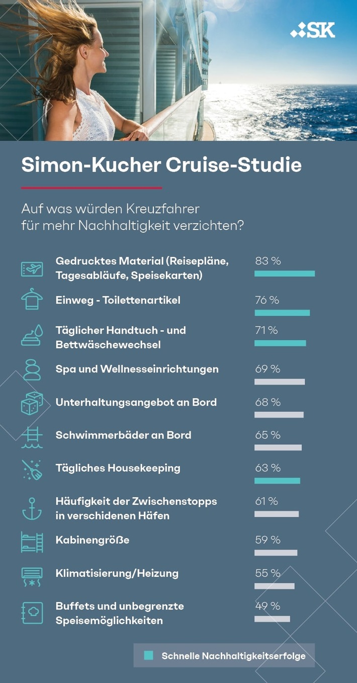 MedienmitteilungCruise-Studie: Deutsche sind Kreuzfahrt-Fans trotz Umweltbedenken - Großteil würde für Nachhaltigkeit aber auf Pools und Buffets verzichten2024-11-12T07:00:16Köln (ots) - Umweltsorgen sind laut der Simon-Kucher Cruise-Studie ein Hauptgrund für Desinteresse an Kreuzfahrten. Besonders Millenials befürchten negative Auswirkungen auf die Natur. Trotzdem ziehen fast 70 Prozent der Deutschen eine Kreuzfahrt in Betracht, jeder Vierte hat sogar hohes Interesse. Eine mögliche Erklärung: Rund 80 Prozent zeigen sich bereit, die CO2-Emissionen zu kompensieren. Im Schnitt sind deutsche Kreuzfahrer bereit, 19 Prozent des Reisepreises für den CO2-Ausgleich zu entrichten, Urlauber unter 44 Jahren würden sogar ein Viertel mehr bezahlen. Für mehr Nachhaltigkeit würde ein Großteil zudem auf Pools, Buffets und unbegrenzte Speisemöglichkeiten verzichten.