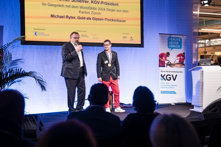 Berufsweltmeister Michael Ryter (Gipser-Trockenbauer) aus Grüt (Gossau ZH) wurde von KGV-Präsident Werner Scherrer als Botschafter seines Berufs und des dualen Berufsbildungssystems vorgestellt. Er habe sich rund drei Monate, meist nach der Arbeit oder an Wochenenden, auf die WorldSkills vorbereitet, schilderte Ryter. Er habe im Gegensatz zu asiatischen, jahrelang gedrillten Hoffnungsträgern weniger Druck verspürt, abzuliefern, sondern einfach mit Stolz seinen Beruf ausgeübt, erzählte Ryter authentisch. Sein Motto: "Aus Freude die Schweiz vertreten." Die regelmässigen Spitzenränge an Berufsmeisterschaften trotz dieser kurzen Vorbereitungszeit seien der Beweis dafür, "dass wir die Besten sind", meinte Scherrer abschliessend.