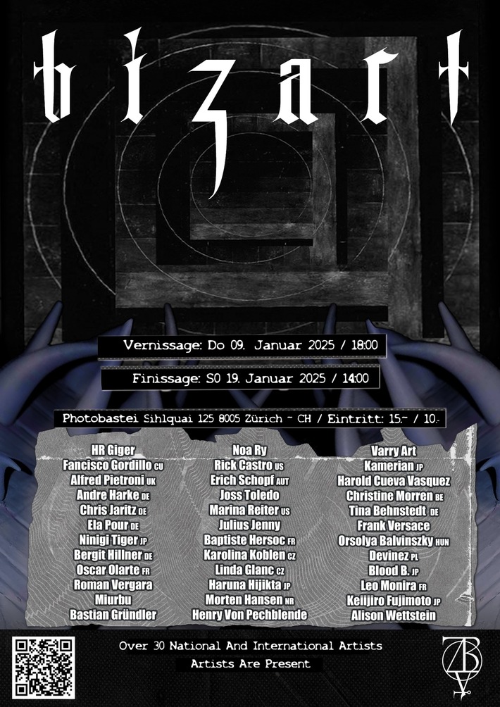 MedienmitteilungVom Louvre in die Photobastei – Das Jahr startet bizarr2024-12-10T06:43:24Die Ausstellung "bizart" in der Photobastei Zürich präsentiert ab dem 9. Januar 2025 eine einzigartige Sammlung von Kunstwerken, die die Grenzen des Konventionellen sprengen. Die Schweizer Cousins Dominic Henry und Alexander Meyer laden ein, in ein Universum einzutauchen, das von ungewöhnlichen Perspektiven, dunklen Themen und experimentellen Techniken geprägt ist. Über 30 nationale und internationale Künstlerinnen und Künstler zeigen und verkaufen ihre Werke, die von Malerei über Fotografie und Skulptur bis hin zu experimentellen Mixed-Media-Arbeiten reichen. Darunter befinden sich innovative Werke von Grössen wie HR Giger und von aufstrebenden Talenten. Ein Highlight sind die 3D-Kunstwerke von Noa Ry, die teilweise bereits im Louvre in Paris zu sehen waren. Ein weiteres Unikum ist der Wiener Naturwissenschaftler Erich Schopf, der mit bunten Bakterien einzigartige Kunstwerke schafft, die die Grenzen zwischen Kunst und Wissenschaft verschwimmen lassen. "bizart" ist mehr als nur eine Ausstellung; es ist ein Statement. Die beiden Initianten möchten mit ihrem Projekt eine Plattform für Künstlerinnen und Künstler schaffen, die sich nicht in Schubladen pressen lassen. Besucher erwartet ein vielseitiges Programm: