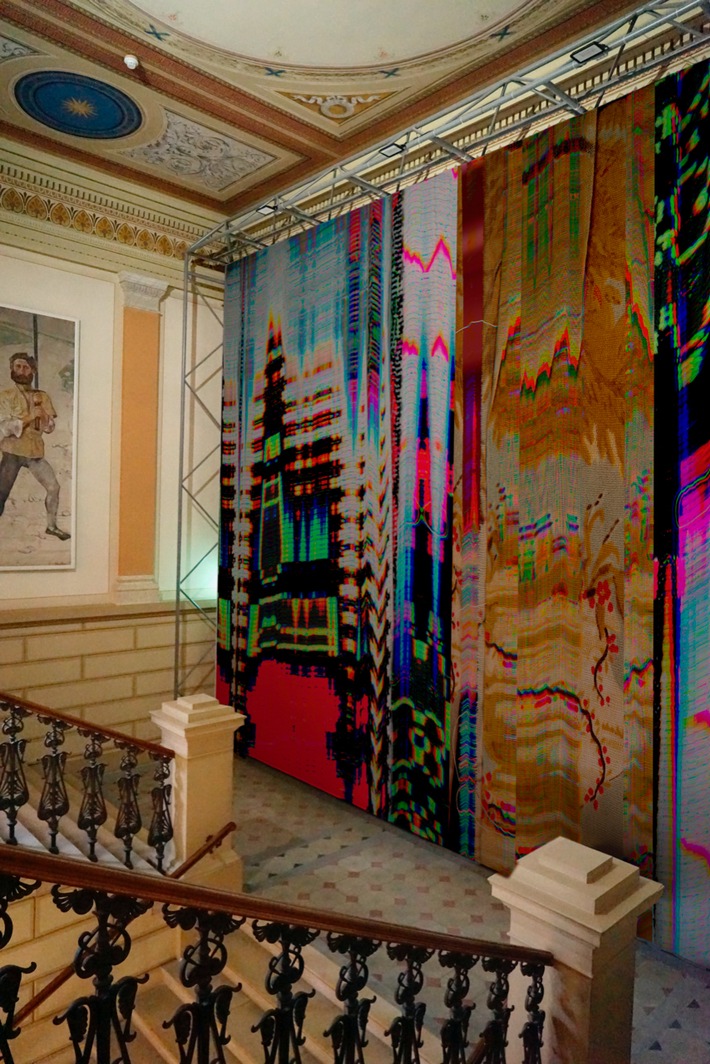 Claudia Caviezels eigens für das Treppenhaus des Kunstmuseums St.Gallen entworfene Wandbehang Glitch besteht aus luxuriösem Baumwollvelours und vereint analoge und digitale Techniken. Das farbenfrohe Design erinnert an Bildschirmstörungen und spiegelt die vertikalen Formen der Treppenspindel wider. Die Künstlerin hat mexikanische Wolldecken namens Serapes auf einem Flachbettscanner hin und her bewegt und dabei unerwartete Bildmuster generiert, bei denen die Kontraste mit Absicht übersteuert wurden. Während die Besuchenden die Treppe hinaufsteigen, tauchen sie in die immersive Umgebung von Glitch ein. Als textile Parallele zu Pipilotti Rists Das Zimmer (das ein überdimensioniertes Fernseh-Wohnzimmer darstellt) lädt Glitch dazu ein, bewegte Bilder neu zu erleben und zu lenken. Mit ihrer intuitiven und experimentellen Herangehensweise schafft Claudia Caviezel Installationen, die spontan und lebendig wirken.