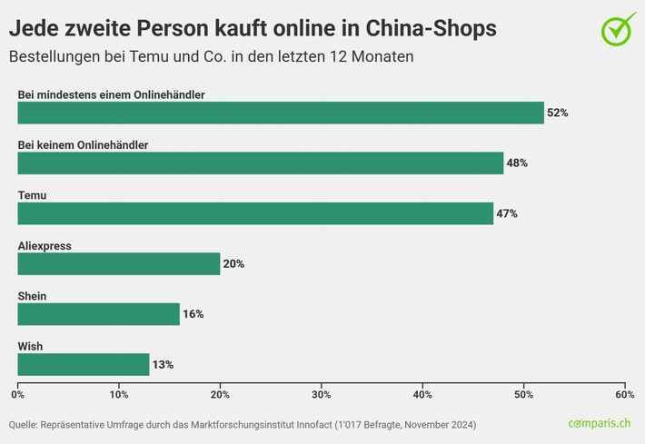 Zürich, 28. Januar 2025 – Jede zweite erwachsene Person hat in den letzten 12 Monaten bei mindestens einem der 4 chinesischen Billig-Onlinehändler Temu, Wish, Aliexpress oder Shein bestellt. Das zeigt eine repräsentative Umfrage des Online-Vergleichsdienstes comparis.ch. Am beliebtesten ist Temu; 47 Prozent der Befragten, die Temu korrekt als chinesischen Onlineshop zugeordnet haben, kauften dort 2024 mindestens einmal etwas. An zweiter Stelle folgt Aliexpress mit 20 Prozent, dahinter Shein mit 16 Prozent. Comparis-Consumer-Finance-Experte Michael Kuhn: «Das bereits 52 Prozent aller Befragten bei mindestens einem China-Shop bestellt haben, zeigt, dass diese inzwischen sehr bekannt sind und von immer mehr Personen genutzt werden.»