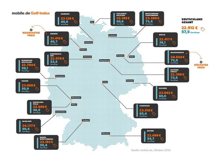Medienmitteilungmobile.de Golf-Index offenbart große Preisunterschiede im Bundesland-Check2025-02-20T15:00:55Berlin (ots) - Die Gebrauchtwagenpreise in den deutschen Bundesländern variieren stark um bis zu 16 Prozent. Das zeigt der mobile.de Golf-Index anhand des beliebtesten Autos der Deutschen. Besonders preiswert sind Gebrauchtwagen aktuell in Bremen, am teuersten in Brandenburg. Die Ergebnisse sowie viele weitere Analysen sind in der aktuellen Ausgabe des m.Q-Reports von Deutschlands größtem Fahrzeugmarkt zusammengefasst.