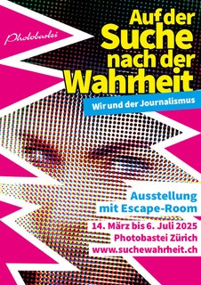 MedienmitteilungAusstellung: «Auf der Suche nach der Wahrheit. Wir und der Journalismus» in der Photobastei2025-03-10T06:00:17Ausstellung:Journalismus als Voraussetzung für Meinungsbildung und die Demokratie «Auf der Suche nach der Wahrheit. Wir und der Journalismus» Die Ausstellung vom 14. März bis zum 6. Juli 2025 in der Photobastei in Zürich ermöglicht, ganz persönliche Erfahrungen auf der Suche nach der Wahrheit zu machen. Denn: Informiert zu sein, die Fakten zu kennen, ist essenziell für uns. Zutreffende, vielfältige Informationen sind die Voraussetzung für politische und gesellschaftliche Debatten und die Entscheidungsfindung der Bürger:innen. Traditionellerweise wurden diese Informationen von den Medien vermittelt, die man kannte und deren Glaubwürdigkeit eingeschätzt werden konnte. Mit Internet und Social Media hat sich das radikal verändert: Die verfügbaren Informationen sind unüberschaubar geworden und ihre Herkunft und Glaubwürdigkeit ist oft ungewiss. Die Ausstellung vermittelt Wissen und Instrumente, um sich selbst im Wildwuchs von Information und Desinformation besser orientieren zu können. Eröffnung: Donnerstag 13. März 2025, ab 18 Uhr Ausstellung: 14. März bis 6. Juli 2025 2. Stock jeweils Mi & So, 12 - 18 h; Do - Sa, 12 - 21 h Sihlquai 125, 8005 Zürich, photobastei.ch Eintritt: 12 / 8 CHF, Jugendliche bis 16 Jahre frei