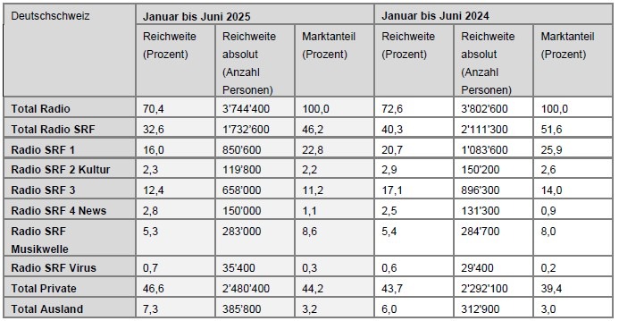 MedienmitteilungRadio-Nutzungszahlen weiterhin im Rahmen der Erwartungen2025-07-10T11:01:18Bern (ots) - Rund sechs Monate nach der UKW-Abschaltung der SRG verzeichnen ihre Radiosender in allen Sprachregionen mit 53 Prozent immer noch den grössten Marktanteil. Die Gesamtreichweite ist im Vergleich zum Vorjahressemester im erwarteten Ausmass gesunken. Der Rückgang ist hauptsächlich auf die UKW-Abschaltung per Anfang Jahr zurückzuführen. Erstmals nach der UKW-Abschaltung der SRG per Ende 2024 veröffentlicht die Mediapulse AG belastbare Zahlen zur Radionutzung. Der Marktanteil der SRG-Sendergruppe ist schweizweit im Vergleich zum Vorjahressemester um 6 Prozentpunkte im Rahmen der Erwartungen gesunken. Dies entspricht den von der SRG diesen April ausserordentlich publizierten Quartalszahlen. Mit 53 Prozent Marktanteil bleibt die SRG nach wie vor klar Marktführerin. Die Kennzahl des Marktanteils ist wichtig, da sie den Anteil am Gesamtvolumen der Radionutzung in der Schweiz aufzeigt. Verluste bei der Reichweite Die Reichweite des Mediums Radio allgemein nimmt ab, da sich das Mediennutzungsverhalten bereits seit einiger Zeit verändert. Der Verlust von minus 7 Prozentpunkten (-14 Prozent) bei der Nettoreichweite der SRG-Sendergruppe im Vergleich zum gleichen Semester 2024 entspricht der erwarteten Entwicklung aufgrund dieser Reichweitenverluste des Mediums und der UKW-Abschaltung. Die Veränderungen gegenüber dem Vorjahressemester der einzelnen Sendergruppen in den jeweiligen Sprachregionen betragen -7,7 Prozentpunkte Nettoreichweite bei SRF (-18 Prozent), -8,0 Prozentpunkte bei RTS (-23 Prozent), -14,1 Prozentpunkte bei RSI (-27 Prozent) und -0,1 Prozentpunkte bei RTR in der Gesamtschweiz (-17 Prozent). Weit fortgeschrittene Digitalisierung Unterdessen sind 87 Prozent der gesamten Radio-Nutzung in der Schweiz digital. Dies zeigen die zeitgleich zur Mediapulse-Semesterpublikation veröffentlichten Resultate der DigiMig-Erhebung, die im Auftrag des Bakom und der Radiobranche diesen Frühling durchgeführt wurde. Die fortschreitende Digitalisierung und die insbesondere im Auto gestiegene Nutzung von DAB+ stimmen die SRG positiv. Dass die technologische Umstellung und Umrüstung Zeit braucht, ist nicht von der Hand zu weisen. Der Schritt der SRG, UKW Ende 2024 abzuschalten, hat diesen Prozess jedoch beschleunigt und ebnet den privaten Radiosendern den Weg, um den vor zehn Jahren gemeinsam beschlossenen und gestarteten Abschaltplan für die UKW-Infrastruktur spätestens Ende nächstes Jahr abzuschliessen. Halbjahresübersicht Radio SRF Im ersten Halbjahr 2025 verzeichnete Radio SRF einen Marktanteil von 46,2 Prozent und bleibt damit Marktführer in der Deutschschweiz. Das entspricht einer absoluten Reichweite von täglich 1,7 Millionen Personen. Im Vergleich zum Vorjahreshalbjahr ist der Marktanteil der SRF-Radios um 5,5 Prozentpunkte im Rahmen der Erwartungen zurückgegangen. Radio SRF 1, Radio SRF 2 Kultur und Radio SRF 3, die bis Ende 2024 noch via UKW verbreitet wurden, sind am stärksten vom Rückgang betroffen. Trotzdem bleiben Radio SRF 1 mit 22,8 Prozent Marktanteil und Radio SRF 3 mit 11,2 Prozent Marktanteil die meistgehörten Radioprogramme der Deutschschweiz. Insgesamt hört auch nach der UKW-Abschaltung fast jede:r zweite Radiohörer:in in der Deutschschweiz täglich ein SRF-Radio. Bei den Reichweiten zeigen sich die Verluste primär bei den reichweitenstärksten Programmen. Neu verzeichnen Radio SRF 1 eine tägliche Reichweite von 850'600 und Radio SRF 3 von 658'000 Personen. Halbjahresübersicht Radio RTS Der Marktanteil der RTS-Radios ist im Vergleich zum Vorjahreshalbjahr insgesamt um 7,7 Prozentpunkte auf 38,9 Prozent im Rahmen der Erwartungen zurückgegangen. RTS Première weist einen Marktanteil von 26,0 Prozent, Radio RTS Espace 2 1,5 Prozent, RTS Couleur 3 3,3 Prozent und RTS Option Musique 8,1 Prozent auf. Nach der UKW-Abschaltung hört also mehr als jede dritte Person ab 15 Jahren in der französischen Schweiz täglich mindestens ein RTS-Radio. Bei den Reichweiten zeigen sich die Verluste wie erwartet. Neu verzeichnen RTS Première eine tägliche Reichweite von 317'700, Radio RTS Espace 2 von knapp 20'900, RTS Couleur 3 von mehr als 67'100 und RTS Option Musique 105'500. Halbjahresübersicht Radio RSI Der traditionell sehr hohe Marktanteil der RSI-Radioprogramme ist im Vergleich zum Vorjahreshalbjahr insgesamt um 13 Prozentpunkte auf 42,7 Prozent zurückgegangen. Die Präsenz der ausländischen UKW-Sender lassen die tägliche Reichweite bei RSI Rete 1 auf 77'200, bei RSI Rete 2 auf 11'400 und bei RSI Rete 3 auf 49'000 sinken. Halbjahresübersicht Radio RTR Die Nutzung des Radiosenders Radio RTR zeigt sich auch nach der UKW-Abschaltung stabil. Täglich erreicht der Radiosender mit seinem Programm in rätoromanischer Sprache schweizweit 20'400 Personen. Quelle Zahlen: Mediapulse Radio Data (Evogenius Reporting), Total Schweiz / Deutschschweiz / französische Schweiz / italienische Schweiz, Personen ab 15 Jahren, 1. Halbjahr 2025 / 1. Halbjahr 2024, Mo-So 24h, NR-%, NR-T, MA%. Quelle DigiMig-Umfrage: https://www.bakom.admin.ch/bakom/de/home/elektronische-medien/technologie/digitale-verbreitung.html Pressekontakt: Medienstelle SRG SSR Permalink: