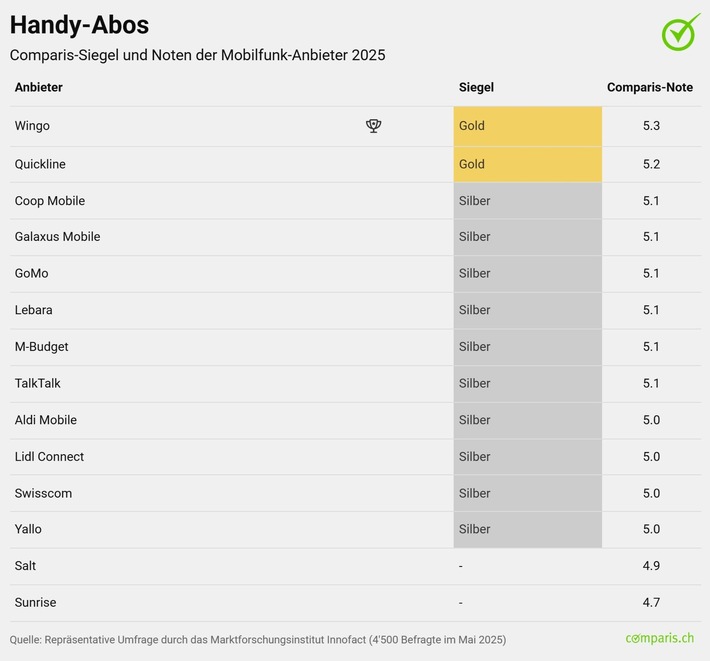 2025 hat erneut die Swisscom-Tochter Wingo die beste Bewertung für Handy-Abos und erhält somit das Gold-Siegel (Note: 5,3). Auf Platz 2 befindet sich Quickline (Note: 5,2), ebenfalls mit dem Gold-Siegel. Auf Platz 3 und in der Kategorie Silber reihen sich Coop Mobile, Galaxus Mobile, GoMo, Lebara, M-Budget Mobile und TalkTalk mit der Note 5,1 ein.