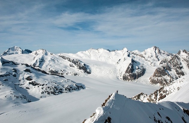 Beni Hug und Tony Sbalbi auf dem Aletschhorn, dem letzten Gipfel ihrer Speed Begehung. Im Hintergrund das Panorama der Aletschregion mit den Viertausendern, die sie in 20h bestiegen haben. Weiterer Text über ots und www.presseportal.ch/pm/100004679 / Die Verwendung dieses Bildes ist für redaktionelle Zwecke honorarfrei. Veröffentlichung bitte unter Quellenangabe: "obs/Mammut Sports Group AG/Julian Beermann"