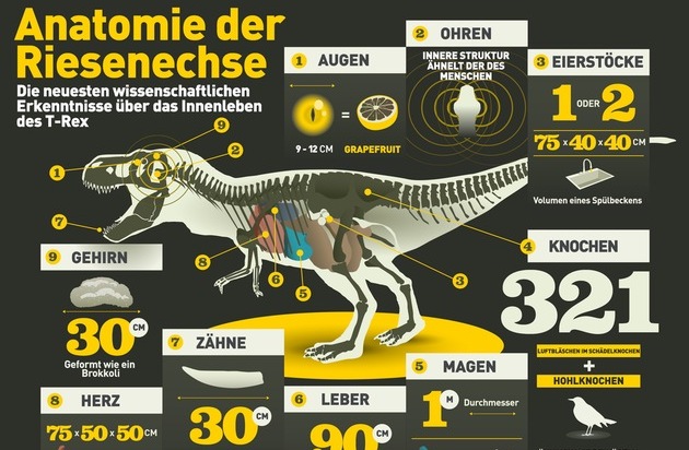 T-Rex Anatomie Infografik. Neun Tonnen Muskeln, Krallen, Knochen und Reißzähne: National Geographic Channel geht in der "Dino Week" ab 7. Juni auf spektakuläre Reise ins Reich der Urzeitgiganten. Weltweite Rechte liegen vor. Weiterer Text über ots und www.presseportal.de/pm/107804 / Die Verwendung dieses Bildes ist für redaktionelle Zwecke honorarfrei. Veröffentlichung bitte unter Quellenangabe: "obs/National Geographic Channel"