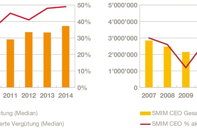 Die CEO-Vergütungen stiegen 2014 in SMI-Unternehmen um 11,8 Prozent, in SMIM-Unternehmen um 6,2 Prozent und in Small-Cap-Unternehmen um 11 Prozent. Insgesamt sank die Medianvergütung von SMI-CEOs allerdings in den letzten acht Jahren von 8,1 Mio. CHF auf 7,5 Mio. CHF (-7,9 Prozent). Bei SMIM- bzw. Small-Cap-Unternehmen hingegen liegt sie mit 3,4 Mio. CHF bzw. 1,4 Mio. CHF nun 19,4 Prozent bzw. 16,1 Prozent über dem Niveau von 2007.