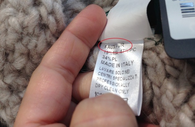 Gesetzesverstoss: Mütze mit echtem Pelzbommel als FAUX FUR beschriftet. Weiterer Text über ots und www.presseportal.ch/de/nr/100057078 / Die Verwendung dieses Bildes ist für redaktionelle Zwecke honorarfrei. Veröffentlichung bitte unter Quellenangabe: "obs/Zürcher Tierschutz"