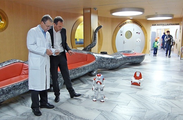 Jürg Stupp zeigt Prof. Dr. med. Felix Niggli die vielfältigen Funktionen des Avatars Nao. Weiterer Text über ots und www.presseportal.ch/de/nr/100004725 / Die Verwendung dieses Bildes ist für redaktionelle Zwecke honorarfrei. Veröffentlichung bitte unter Quellenangabe: "obs/Helsana Gruppe/Claudia Kurt"